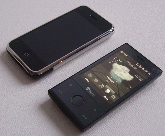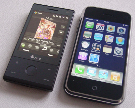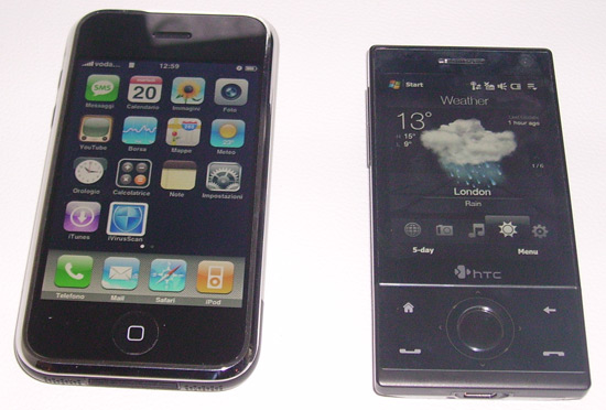 In occasione della presentazione italiana erano disponibili diversi terminali HTC Diamond per una prova diretta da parte dei giornalisti. Macity non ha perso l’occasione per raccogliere una prima serie di impressioni dal vivo sull’utilizzo reale dello smartphone. Nonostante l’impressionate numero di funzioni e specifiche hardware integrate Diamond risulta piuttosto compatto e leggero. In alcune fotografie lo abbiamo accostato a un iPhone di prima generazione per avere un’idea più immediata degli ingombri. iPhone risulta sensibilmente più largo, lungo e pesante rispetto al Diamond, mentre lo spessore è praticamente indentico. Ecco i numeri di Diamondi in dettaglio 102x51x11,33 millimetri, peso 110 grammi.