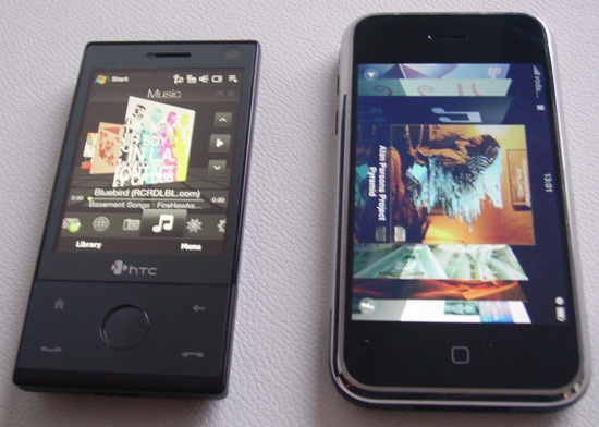 Per la visualizzazione del catalogo musicale e delle fotografie Diamond utilizza un sistema simile al CoverFlow di Apple anche questo visto su iPhone e iPod touch: invece dello scorrimento orizzontale foto e copertine degli album devono essere trascinate verso l’alto o verso il basso. Anche qui abbiamo una rappresentazione grafica 3D che oltre a far scorrere gli oggetti nella direzione verticale desiderata, inclina leggermente le anteprime durante lo spostamento. Qui Diamond è risultato meno convincente delle soluzioni finora adottate da Cupertino: lo scorrimento nel terminale di provato in anteprima è risultato poco fluido. Il personale di HTC che illustrava le funzioni di Diamond ha dichiarato che il software è ancora in versione beta e che nelle versioni che verranno commercializzate stabilità del sistema e fluidità dell’interfaccia risulteranno migliori. Scatti nella animazioni e una risposta non sempre precisa sono stati riscontrati sia nelle anteprime delle fotografie, sia nella schermata in cui è possibile navigare graficamente tra le cover degli album. Una volta scelta una fotografia Diamond ingrandisce l’immagine a tutto schermo ed esegue rapidamente ingrandimenti e riduzione delle dimensioni, senza tentannamenti. Per stabilire la reale bontà dell’interfaccia utente, delle diverse tastiere disponibili e soprattutto per esprimere un giudizio definitivo sulle prestazioni del Diamond è necessario attendere le versioni in commercio dello smartphone dotate del software in versione definitiva. Fin dai primi istanti di utilizzo però, chi è abituato a lavorare con un iPod Touch o un iPhone può trovarsi un poco spaesato a causa delle dimensioni più contenute dello schermo, ma anche per le scelte grafiche adottate da HTC, questo soprattutto per lo scorrimento delle anterprime. Nei due tascabili della Mela la superficie visibile più ampia permette di vedere la cover non solo dell’album immediatamente precedente e successivo a quello centrale, ma anche di una o due canzoni che vengono prima e dopo nell’elenco.