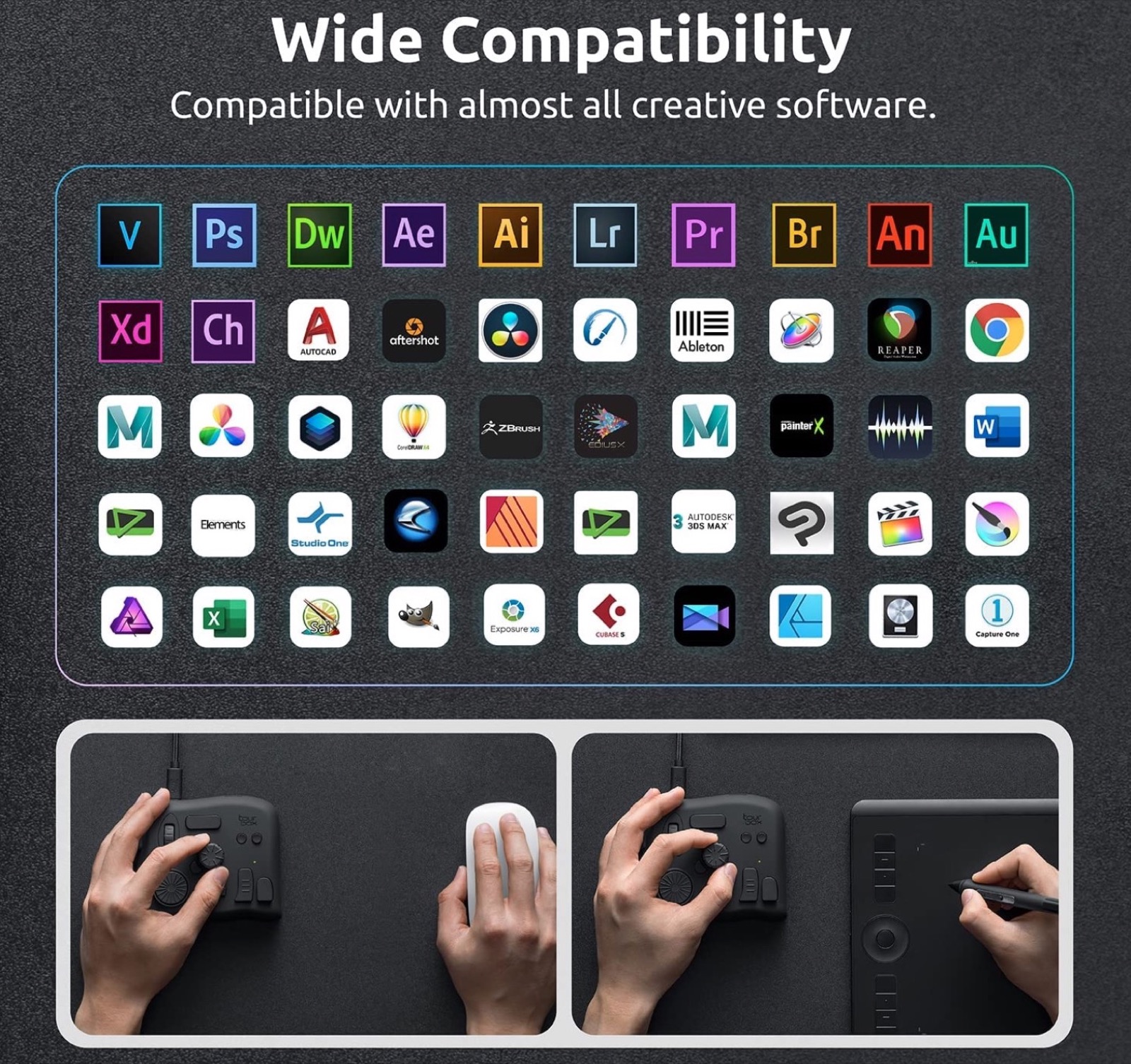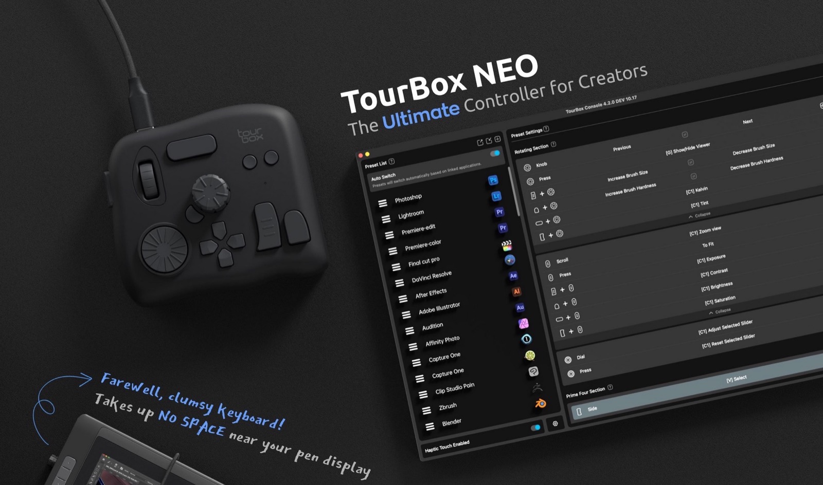Come dicevamo in apertura, TourBox NEO è compatibile con tutti i programmi Mac e Windows che si basano sulle scorciatoie da tastiera e supporta quasi tutti i software creativi come ad esempio Photoshop, Lightroom, Premiere, Illustrator, DaVinci Resolve, FCPX, Clip Studio Paint, Camera Raw, Capture One, SAI, AutoCAD, Blender, Pro Tools, Chrome, iTunes e Spotify.