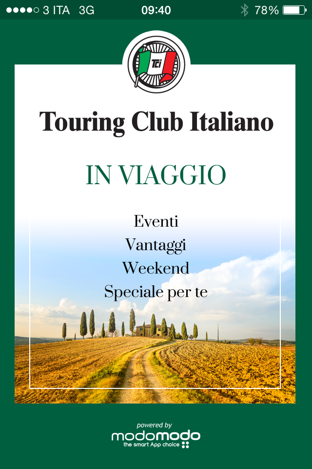 Nella sezione Weekend gli utenti trovano suggerimenti per trascorrere brevi soggiorni fuori dai soliti percorsi turistici. L’area Eventi raccoglie mostre, concerti, festival e tutti gli appuntamenti organizzati direttamente dall’Associazione. Grazie alla nuova app Touring in viaggio, sviluppata sulla piattaforma modomodo, i soci Touring possono avere sempre con sé e visualizzare una versione digitale della propria tessera. Da questa schermata è anche possibile richiedere soccorso in caso l’automobile si guasti.