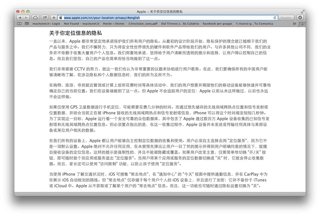 Tornando alla funzione Luoghi Frequenti, la società scrive: “Apprezziamo gli sforzi di CCTV di educare gli utenti su un argomento che riteniamo importante. Vogliamo essere sicuri che tutti i nostri clienti in Cina comprendano cosa facciamo e cosa non facciamo quando si parla di privacy e dati personali”. “I nostri utenti” continua Apple, “vogliono e si aspettano che i loro dispositivi mobili siano velocemente e in modo affidabile in grado di determinare la loro posizione corrente per specifiche attività quali shopping, viaggi, individuare il più vicino ristornate o calcolare il tempo necessario per arrivare a lavoro. Facciamo questo a livello di dispositivo. Apple non traccia la posizione dell’utente. Apple non l’ha mai fatto e non ha intenzione di farlo”.