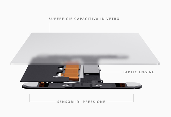 Se esternamente non si notano particolari differenze con i precedenti Trackpad, sotto la superficie che vediamo – una superficie capacitiva in vetro – cambia moltissimo: dimentichiamoci il meccanismo “a trampolino” che richiedeva spazio sotto la superficie per consentire il movimento verso il basso del clic. Ora i sensori di pressione rilevano il clic da qualsiasi punto del Trackpad. L’utente avrà l’impressione che il Trackpad si abbassi sempre e riceverà un feedback tattile: si accorgerà immediatamente che il nuovo Trackpad è davvero in grado di avvertire i comandi più impercettibili anche dalle aree più periferiche della superficie.