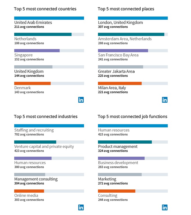 I londinesi, per esempio, hanno in media più collegamenti LinkedIn rispetto ai residenti di qualsiasi altra città del pianeta, seguiti da Amsterdam, San Francisco, Jakarta e la nostra Milano, mentre gli Emirati Arabi Uniti hanno più connessioni medie di qualsiasi singolo paese.