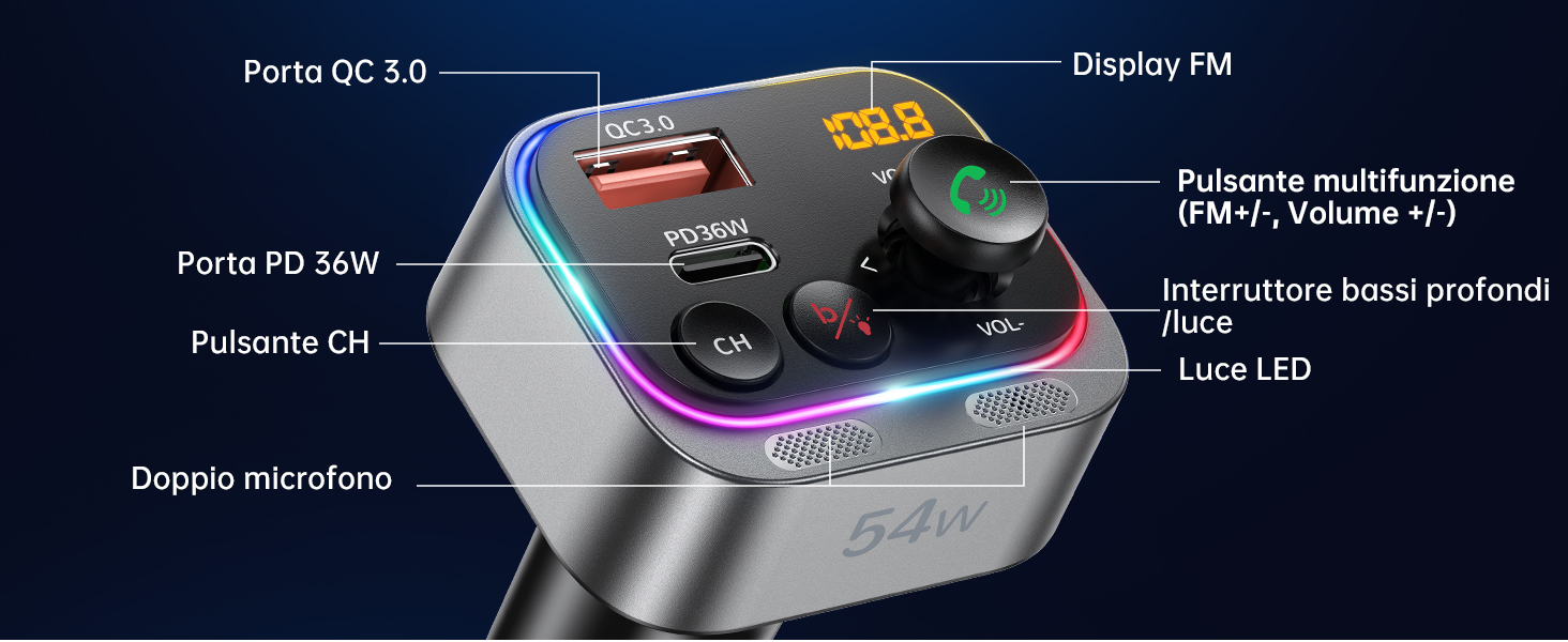 La nuova versione Bluetooth 5.4 assicura una connessione stabile con smartphone iOS e Android, con trasmissione audio limpida su qualsiasi autoradio FM. Il microfono integrato con soppressione del rumore CVC permette chiamate chiare anche in ambienti rumorosi. Supporta comandi vocali via Siri e Google Assistant. Non richiede installazioni: si collega in pochi secondi, mantenendo la compatibilità con qualunque veicolo da 12–24V.