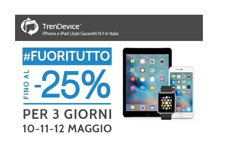 Su TrenDevice, sito N.1 in Italia per vendere e comprare iDevice usati, ti aspetta il FUORI TUTTO: il 10, 11 e 12 Maggio SCONTI fino al -25% su iPhone, iPad ed Apple Watch Usati Garantiti!