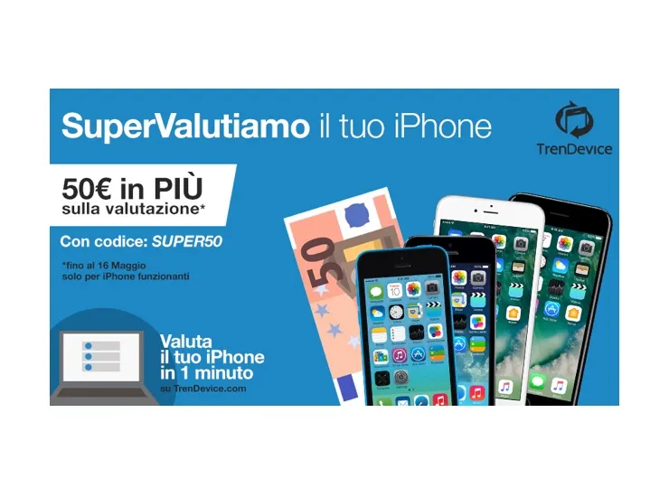 Su TrenDevice torna a sorpresa la Super Valutazione sulla vendita del vostro iPhone! Se stavate già pensando di venderlo o se avete intenzione di farlo adesso, oggi è il momento giusto perché TrenDevice acquista il vostro iPhone e vi regala 50€ in più sulla valutazione, ma affrettatevi: avete tempo solo fino al 16 maggio.