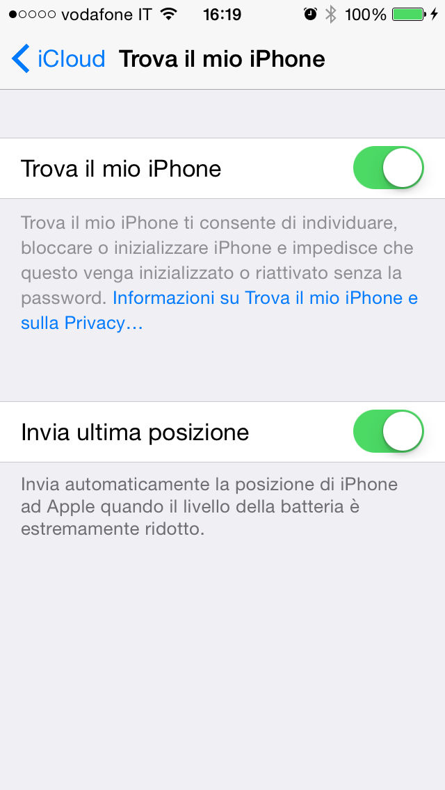 All’interno del menu Trova il Mio iPhone è possibile attivare la funzione di invio ultima posizione GPS; in questo modo, il sistema operativo invierà automaticamente al cloud la propria posizione prima di spegnersi, quando la batteria è scarica.