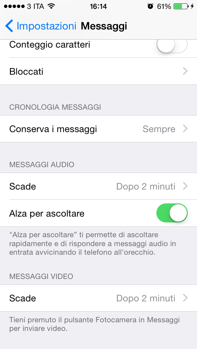 Entrando nel menu Impostazioni e recandosi alla sezione Messaggi, sarà possibile decidere per quanto tempo mantenere in memoria le conversazioni iMessage. Impostando Sempre i messaggi non verranno mai cancellati, ma scegliendo 30 giorni o un anno, iOS 8 cancellerà in automatico le conversazioni dopo un mese o 365 giorni.
