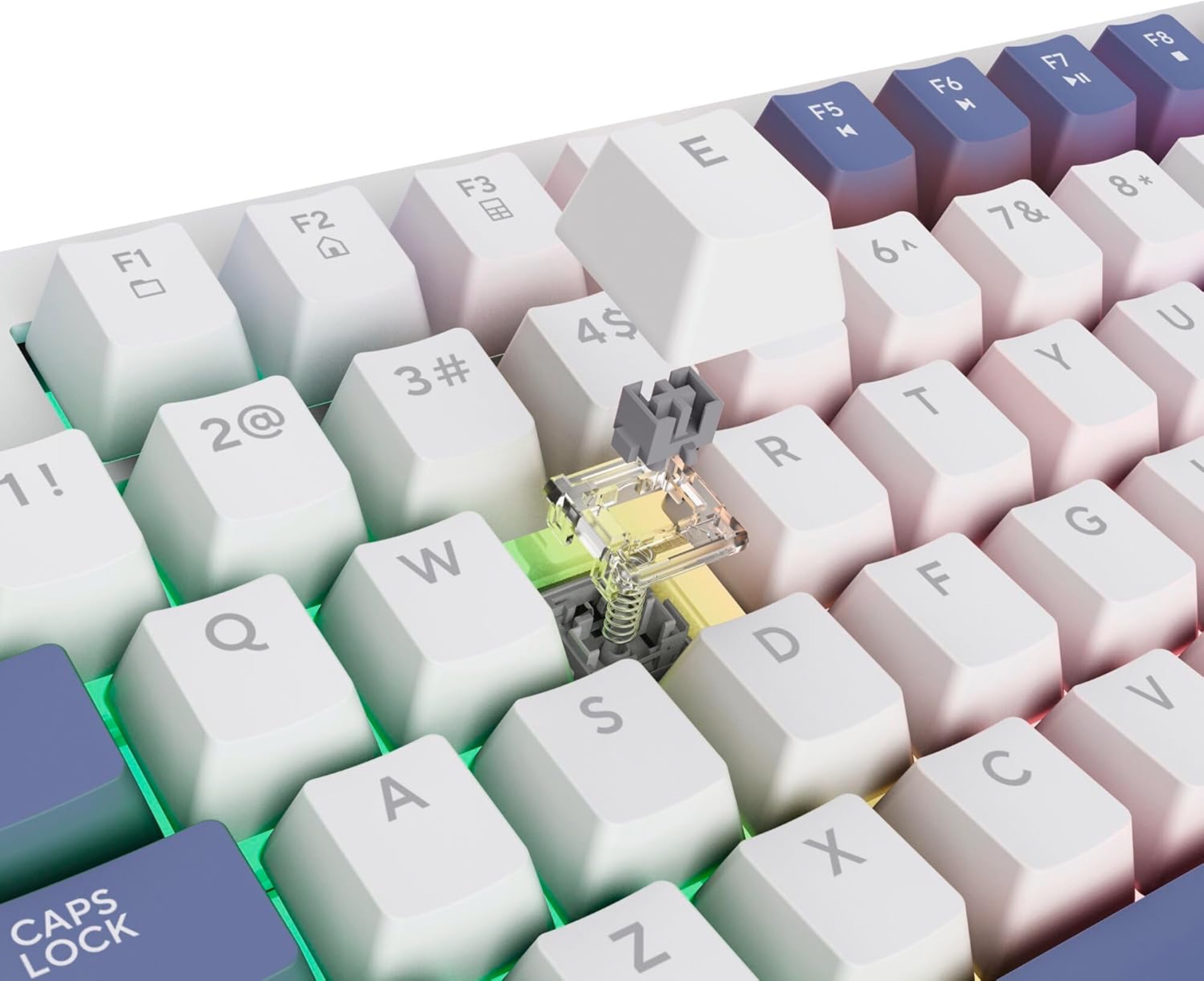 Grazie alla compatibilità hot-swap con switch a 3 e 5 pin è possibile sostituire gli interruttori senza bisogno di saldature (volendo anche tramite l’estrattore 2-in-1 per keycap e switch incluso in confezione) e di serie la tastiera è equipaggiata con switch lineari LEOBOG Seiya a 5 pin che sulla carta offrono una durata di almeno 60 milioni di pressioni.