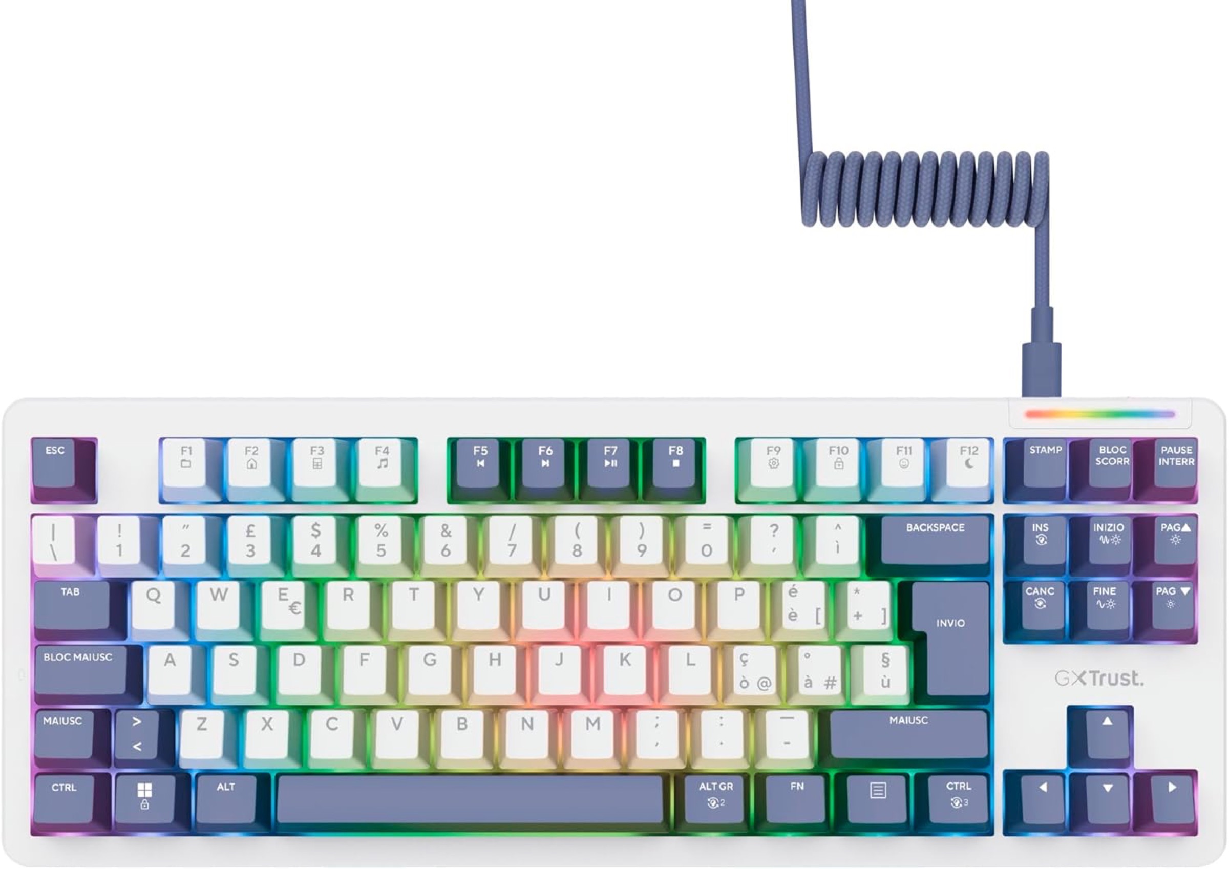 La tastiera offre anche 12 tasti funzione (Fn) per il controllo rapido delle funzioni multimediali ed è accompagnata da un cavo USB-A a USB-C spiralato e rimovibile che mantiene tutto più ordinato.
