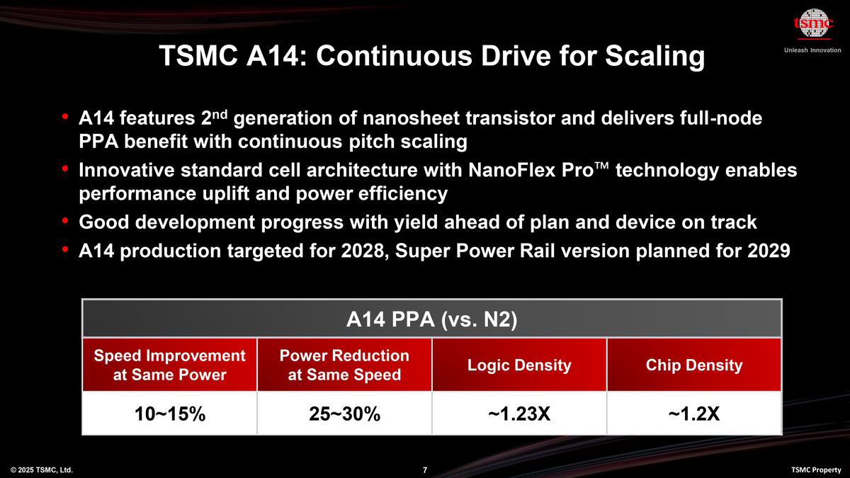 Il nodo da 2nm è quindi un significativo passo avanti che però, com è stato spiegato ne North American Technology Symposium 2025, non arriverà subito ma A14 a partire dal 2028.