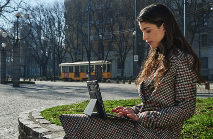 Tucano Tasto può essere usata come custodia totale, cover posteriore e anche per lavorare con iPad Pro come faremmo con un computer portatile, per scrivere e rispondere alle mail tramite tastiera con il tablet appoggiato sulle gambe.