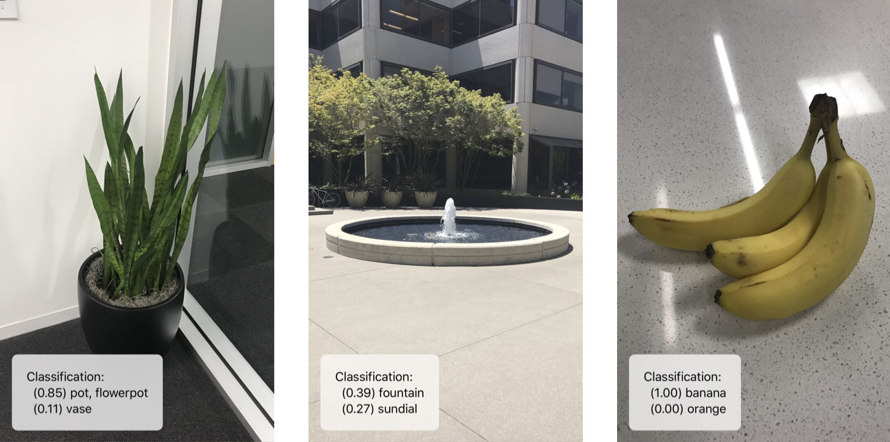 Nel ReadMe Apple mostra un esempio con un meccanismo che permette di classificare un’immagine in base al suo contesto/contenuto e identificare a quale categoria o classe l’oggetto appartiene. Tutto il meccanismo richiede poche righe di codice e nell’immagine di accompagnamento è mostrato un esempio di app per iOS che identifica automaticamente un vaso da fiori, una fontana e una banana.