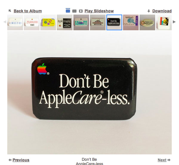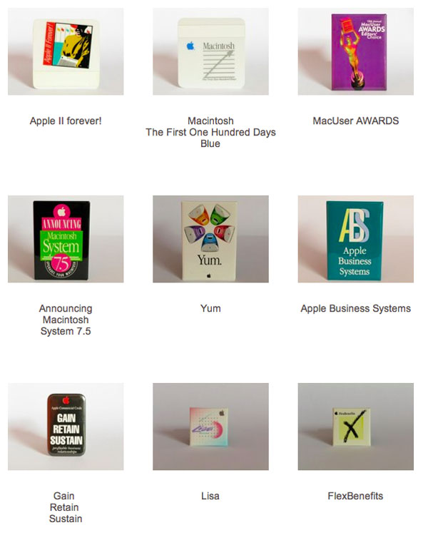 I fan di Cupertino gongolano alla vista di qualsiasi oggetto Made in Cupertino, questa è una realtà a cui pochi si sottraggono, in ogni caso la raccolta di Paolo merita almeno una seconda occhiata per una semplice ragione. Nel corso del tempo lo stile e i prodotti della Mela sono cambiati: le spille e i bottoni rispecchiano fedelmente questo cambiamento. Così anche gli utenti che collezionisti non lo sono, non potranno fare a meno di ammirare la spilla rilasciata per l’Apple IIe, poi quella per il primo Mac e a seguire spille e bottoni del modelli successivi. Non solo le macchine e i software della Mela segnano la linea temporale, ma anche lo stile della grafica e ovviamente il logo di Cupertino, ad iniziare dalla Mela con le bande colorate, fino ad arrivare a quella dal look metallizzato e stilizzato dei nostri giorni.