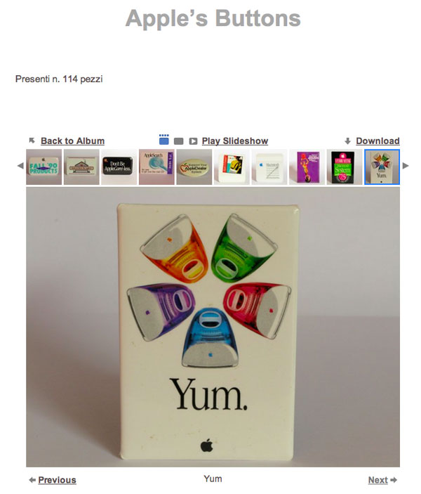 Per catalogare la propria raccolta e per raggiungere anche altri collezionisti, Paolo ha creato un sito con iWeb in cui è possibile ammirare buona parte delle spille e dei bottoni in suo possesso: nel momento in cui scriviamo sono catalogati ben 114 button e 52 pin. Oltre alle fotografie in miniatura che i navigatori del Web possono scorrere per una rapida panoramica, è possibile esaminare da vicino ogni singolo pezzo, inoltre è anche possibile attivare la modalità presentazione, in questo modo le immagini ingrandite scorrono in modo automatico.