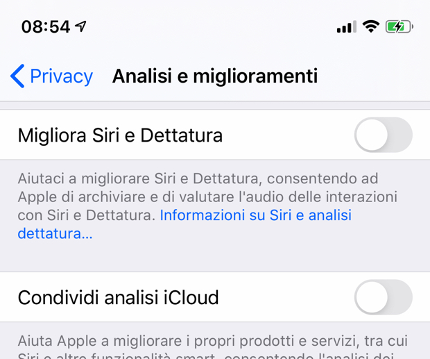 Quando aggiornate il sistema operativo o installate iOS 13.2 per la prima volta la schermata iniziale per la privacy di Siri consentirà subito di annullare la condivisione delle registrazioni audio e testuali di Siri con Apple. Ma potete disabilitarli anche nelle impostazioni delle privacy in un secondo momento nella sezione Impostazioni > Privacy > Analisi e miglioramenti.