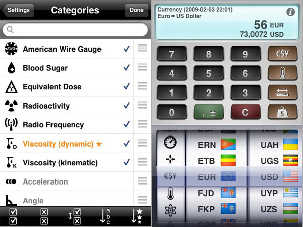 Tra i datai più “esotici”, che faranno felici studenti di ingegneria, fisica e di altre discipline (anche dei licei) ci sono flusso magnetico, densità di flusso magnetico, lumiannza, densità radioattività , vischiosità dinamica e cinematica, radiofrequenze e via dicendo. Mentre, per chi viaggia e fa shopping all’estero, le immancabili tabelle di conversione delle taglie e misure per vestiti e scarpe. Sono aggiunti anche tabelle di conversione tra formati di media masterizzabili (Cd-r, Dvd-r etc) e video formati (Dv, Hdv, Dvcam). L’applicazione è localizzata anche in italiano ed è compatibile sia con iPhone che iPod touch.