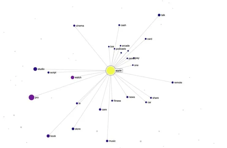Adoro il modo in cui Apple nomina le cose: FireWire, App Nap, iPhone, iPod, EarPod, AirPod, AirPlay, FairPlay ecc. È giocoso molte parole e suoni vengono riutilizzati. Avendo appena finito di leggere la biografia di Steve Jobs, ho deciso di visualizzare vari nomi di prodotti e funzionalità Apple come una rete per vedere questo riutilizzo in azione. Ho preso i nomi dall’elenco pubblico dei marchi di Apple