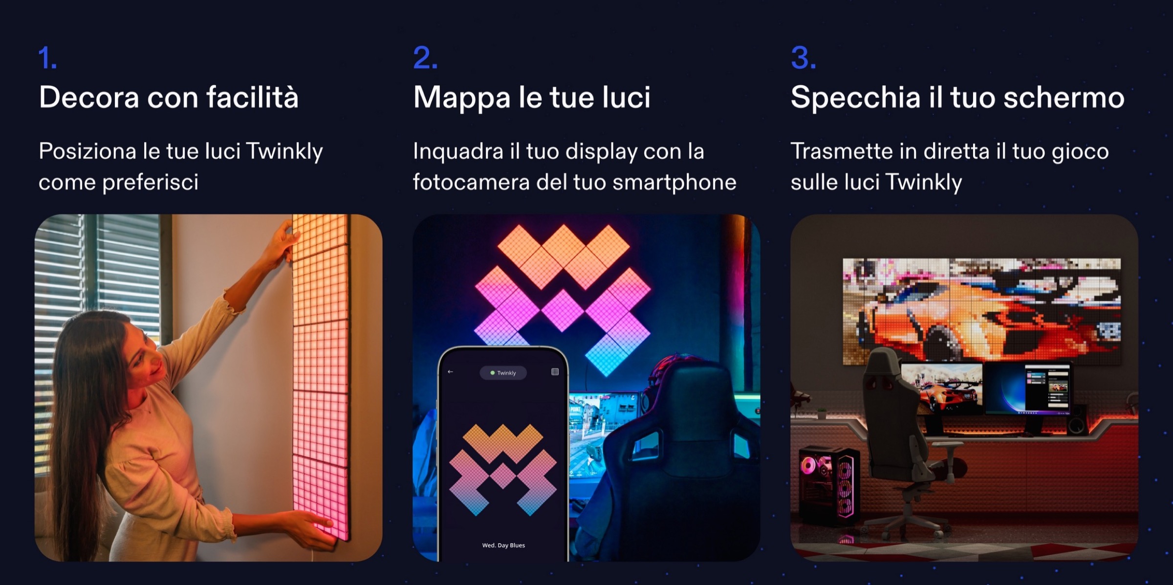 Ogni pannello può essere personalizzato scegliendo tra 16 milioni di colori tramite l’app Twinkly per iPhone, iPad e Android.