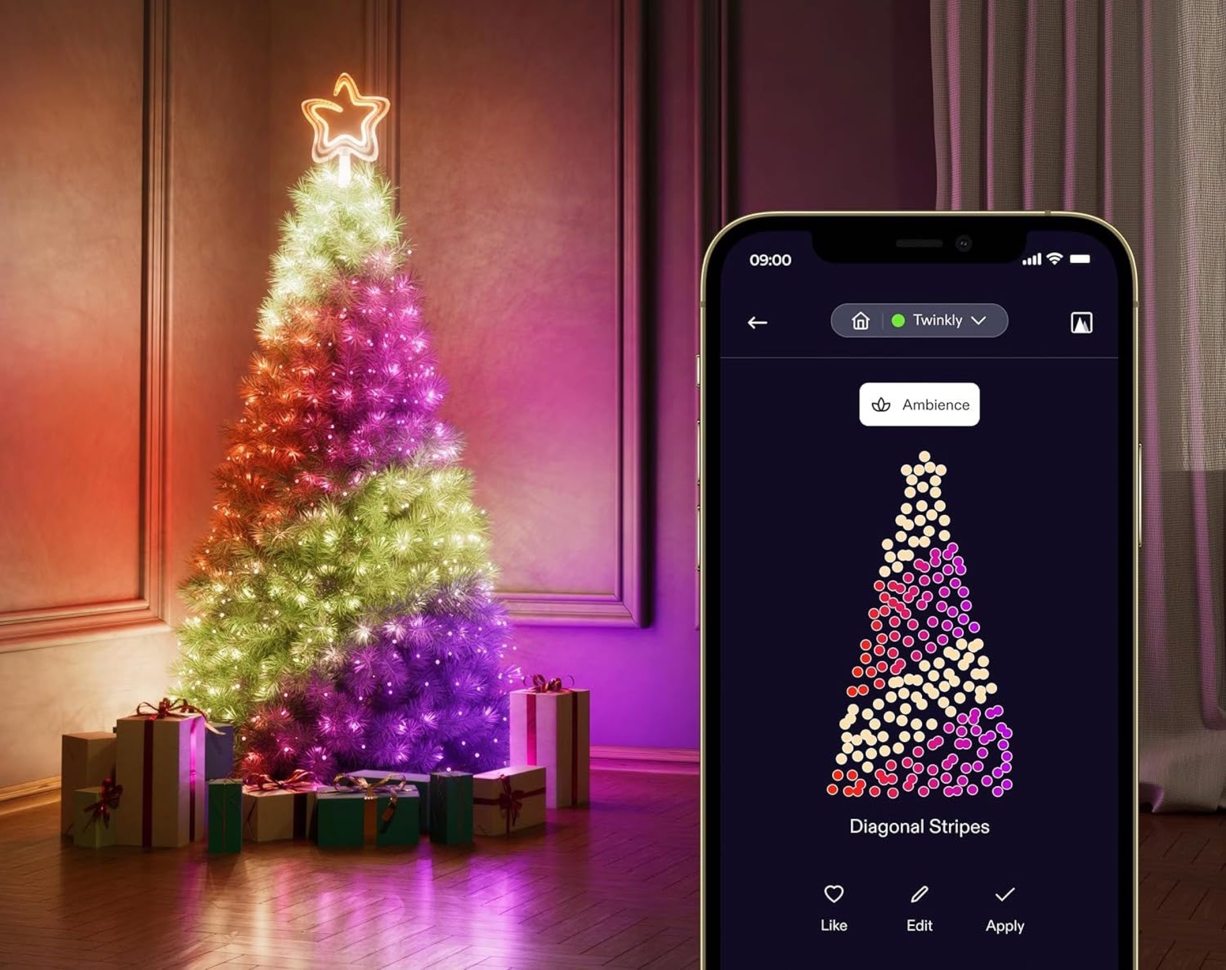 Dopo averlo montato, basta inquadrarlo con la fotocamera del telefono per scansionare e mappare il puntale: a quel punto sarà possibile creare scenari luminosi personalizzati, scegliendo tra quelli preimpostati o progettandone di nuovi completamente da zero.