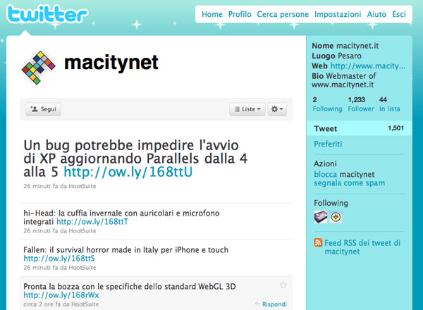 Ricordiamo ai lettori che anche Macitynet è presente su Twitter: la pagina di Macitynet è raggiungibile da questo collegamento. Per rimanere sempre aggiornati anche tramite Twitter sul mondo della Mela con Macitynet è sufficiente iscriversi gratuitamente ai tweet di Macity che attualmente ha più di 1200 followers.