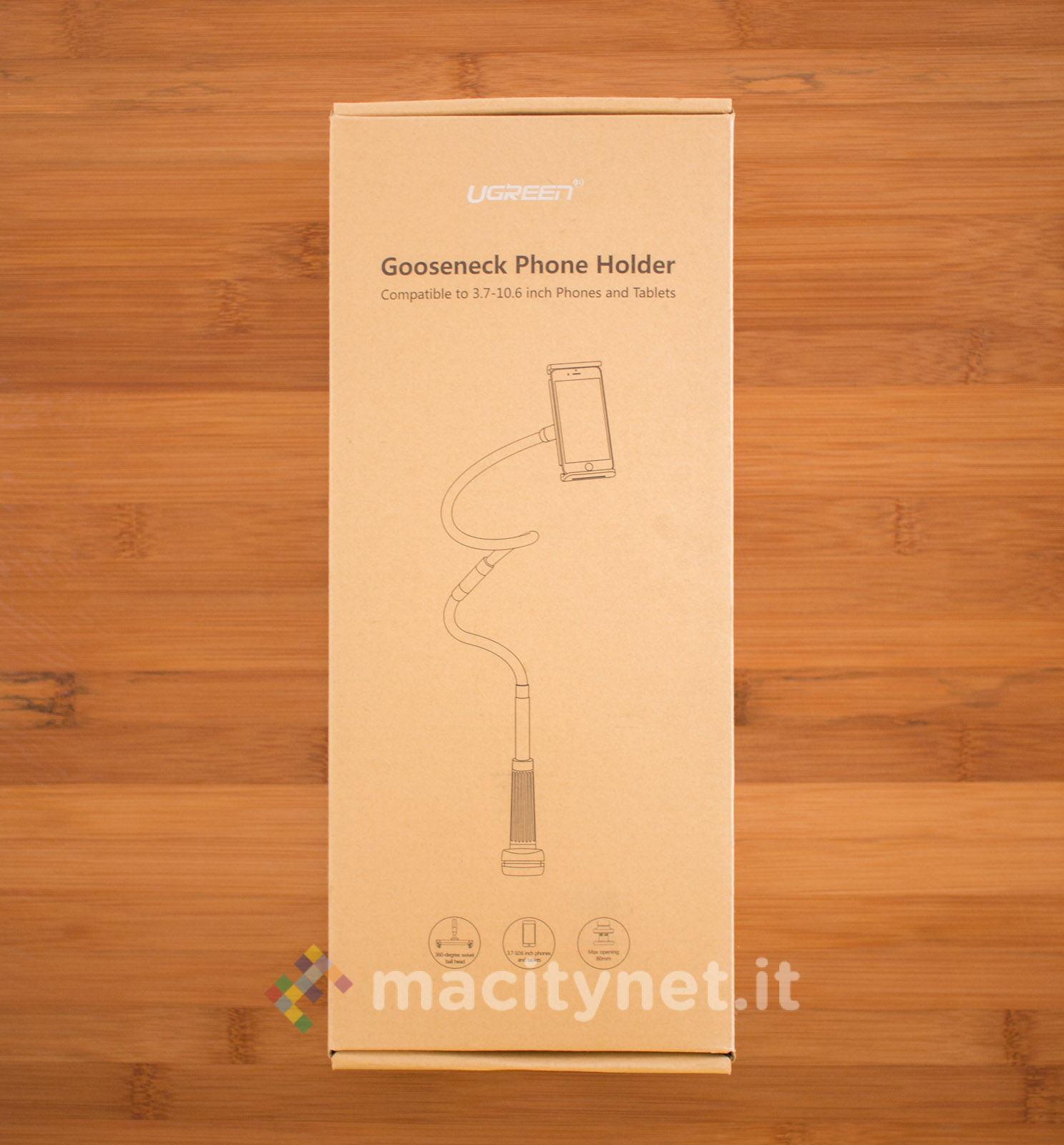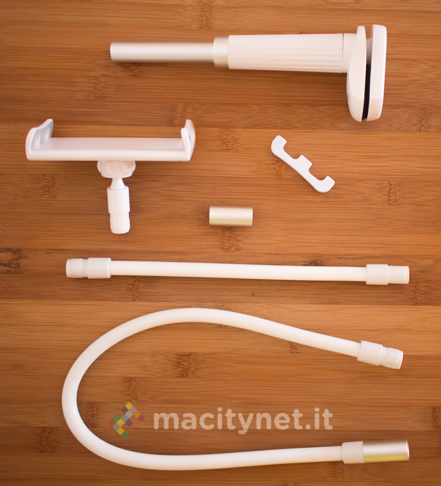 Innanzitutto, funziona con qualsiasi dispositivo, dal più piccolo smartphone da 4 pollici fino a tablet con diagonale da 11–12 pollici, senza dimenticarsi degli e-reader qualora si volesse sfruttare il sistema per leggere un buon libro con le mani dietro la testa. In secondo luogo è caratterizzato da due sezioni componibili che permettono di regolarne la lunghezza per sfruttarlo, col minimo ingombro, in qualsiasi ambiente.