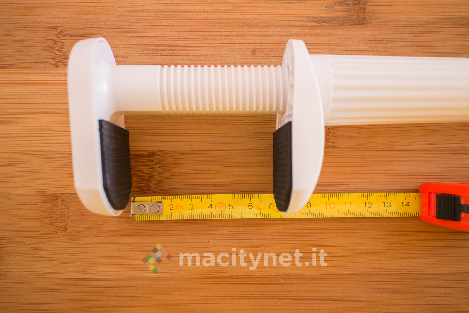 Abbiamo fatto diverse prove in casa, agganciandolo al piano di lavoro della cucina, al bracciolo in metallo del divano, al manubrio del tapis roulant ed alla spalliera del letto, intercambiando le sezioni in base alle esigenze del momento. La situazione limite si è verificata sfruttando il supporto alla massima lunghezza ed agganciando il nostro iPad Air che, tra cover e vetro temperato, raggiunge i 580 grammi di peso complessivi.