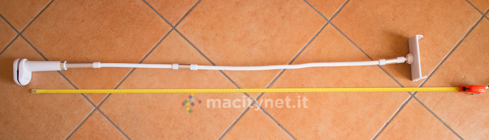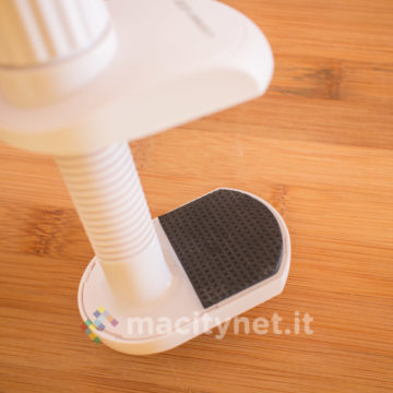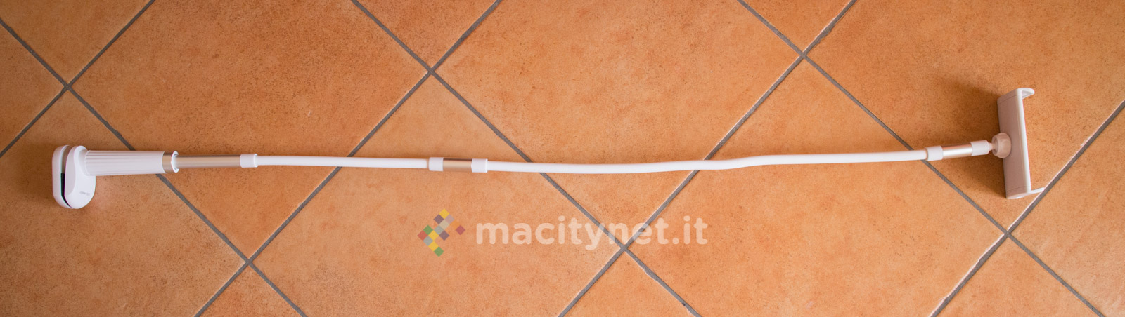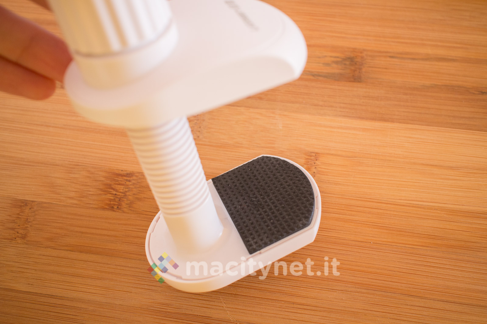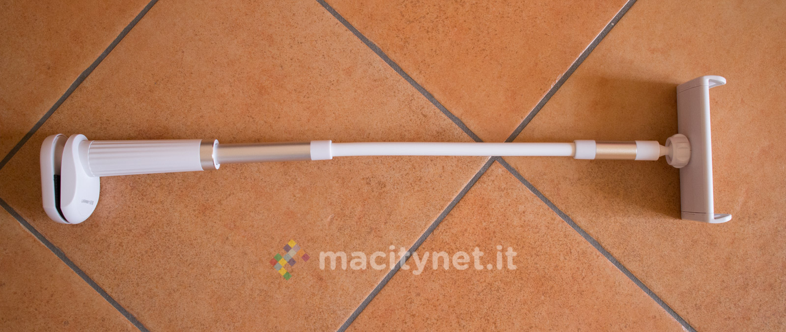 A questa base è possibile agganciare una o due sezioni tubolari, entrambe realizzate in metallo con un rivestimento gommato all’esterno. La più corta misura circa 26 centimetri mentre l’altra è lunga intorno ai 58 centimetri. Nel caso si volessero utilizzare entrambe, stando alle nostre prove per una migliore stabilità è necessario fissare quella più corta in prossimità della base e poi, alla prima asta, la seconda sezione. In questo modo sarà la più corta, che risulta per tra l’altro maggiormente rigira, a dover sostenere il peso dell’altra asta, alla quale sarà poi fissato il tablet.