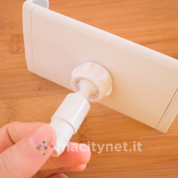 Sia che si agganci una o due aste, al termine di queste sarà poi necessario fissare la pinza dedicata al bloccaggio di smartphone e tablet. L’aggancio avviene attraverso una testa a sfera accompagnata da un’apposita rondella per bloccare l’inclinazione della piastra. Anche questa è realizzata interamente in plastica piuttosto robusta con alcuni inserti in gomma per evitare che smartphone o tablet scivolino via. Le due alette alle quali si bloccano questi ultimi sono leggermente ricurve proprio per migliorare la presa e sono accompagnate una da un ampio foro, l’altra da due aperture più piccole, assicurando la piena compatibilità con le porte di qualsiasi dispositivo, al quale potrà quindi essere collegato ad esempio il cavo di ricarica o un paio di cuffie con filo durante l’uso col supporto.