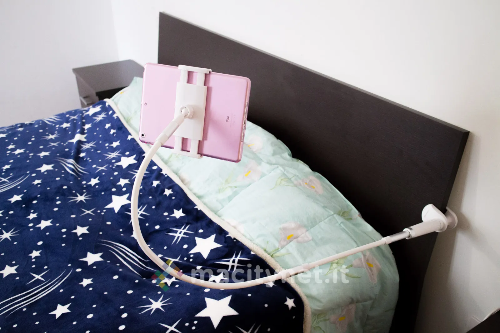 Abbiamo volutamente posizionato il supporto in modo tale che soffrisse al massimo il peso del tablet, ma nonostante ciò non ha mostrato cenni di cedimento (vedi foto seguente). Le sezioni, in effetti, sebbene si possano flettere con la sola forza delle nostre mani, sono molto più rigide di quelle che abbiamo trovato in altri supporti simili, e ciò gioca un ruolo fondamentale nella resistenza alla flessione anche con pesanti dispositivi al seguito. Toccando lo schermo del tablet, quest’ultimo ondeggiava leggermente, ma il braccio non si è mai piegato verso il basso, permettendoci di guardare tranquillamente un film a letto senza dover tenere il dispositivo con le mani.