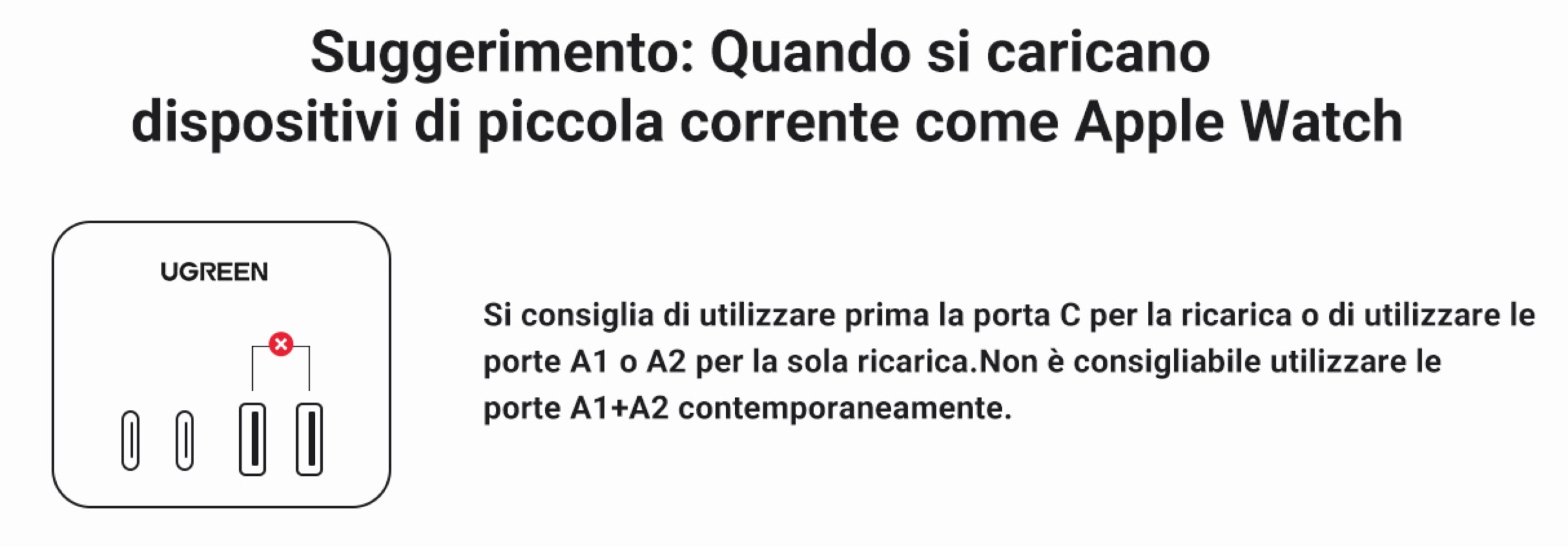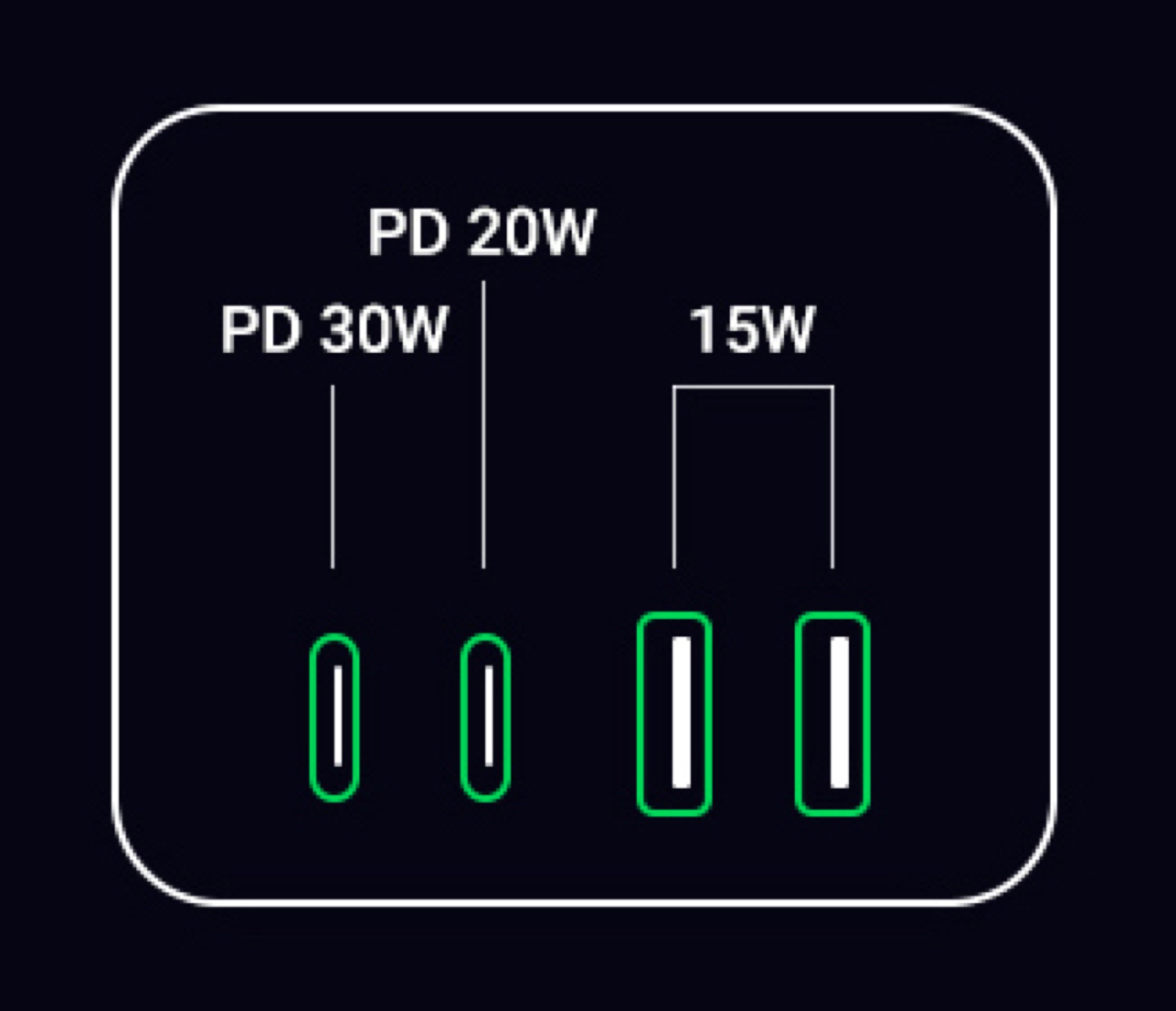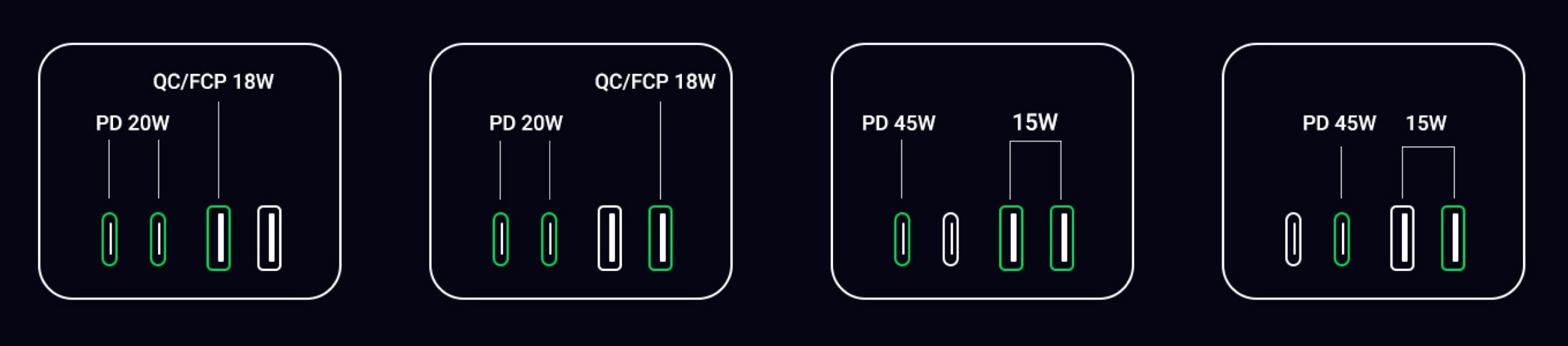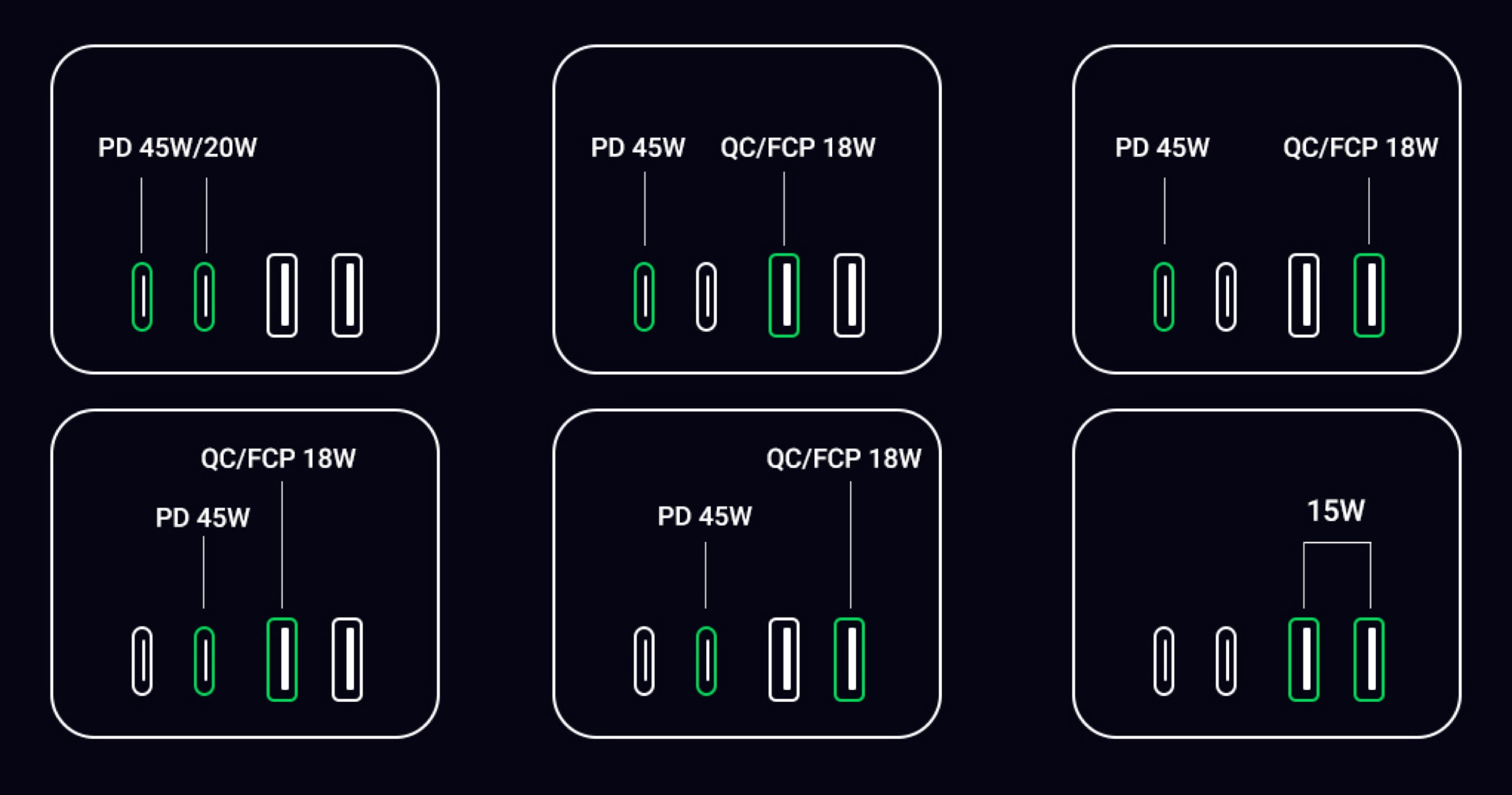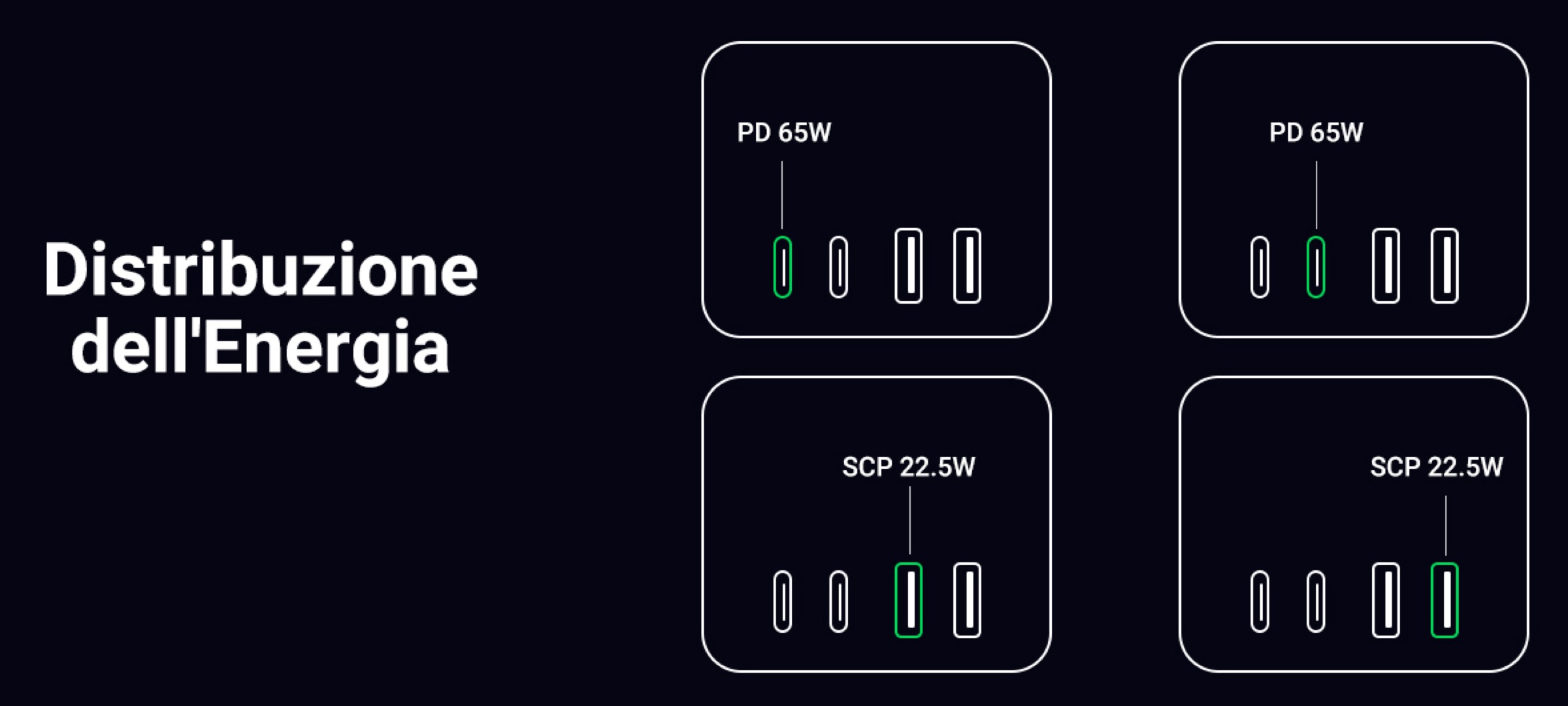 Chiaramente la potenza di uscita varia in base al numero e all’esigenze di ricarica dei dispositivi collegati. Nelle immagini che seguono trovate uno schematico riepilogo di come le porte si adattano in base al numero di ricariche in corso: