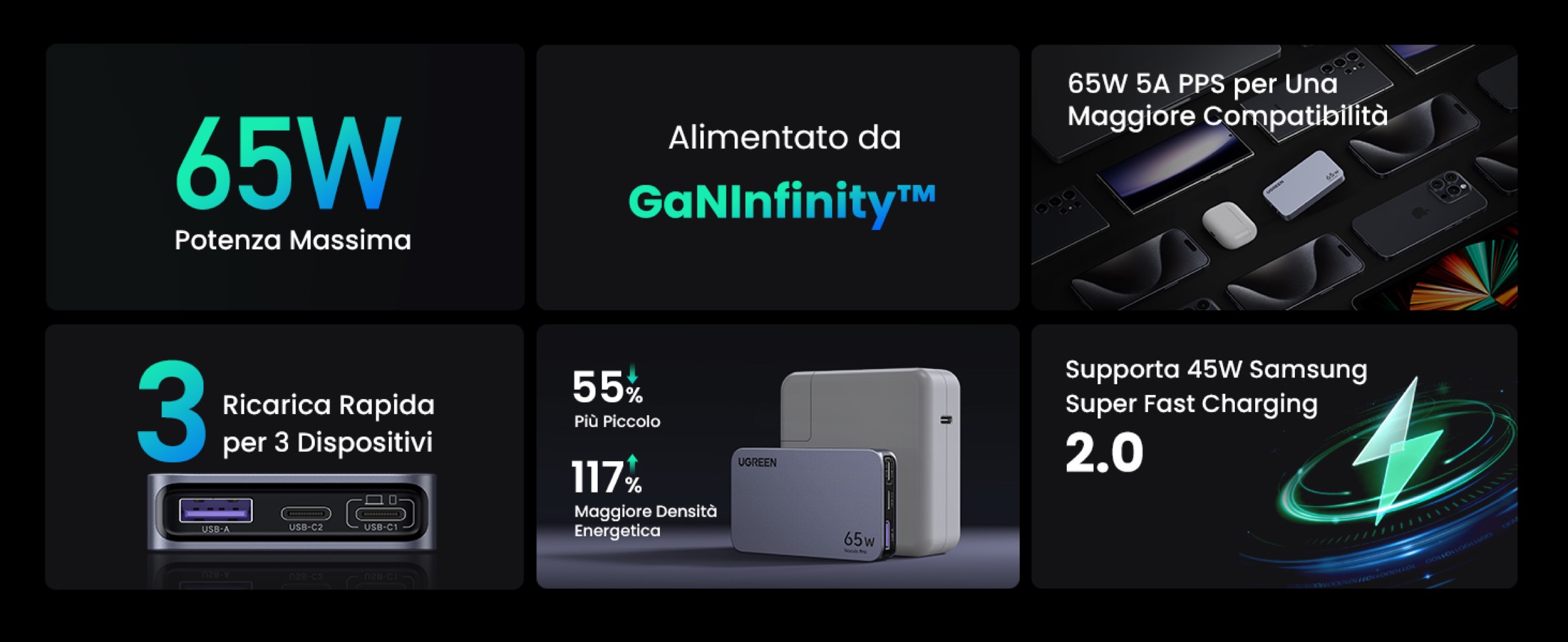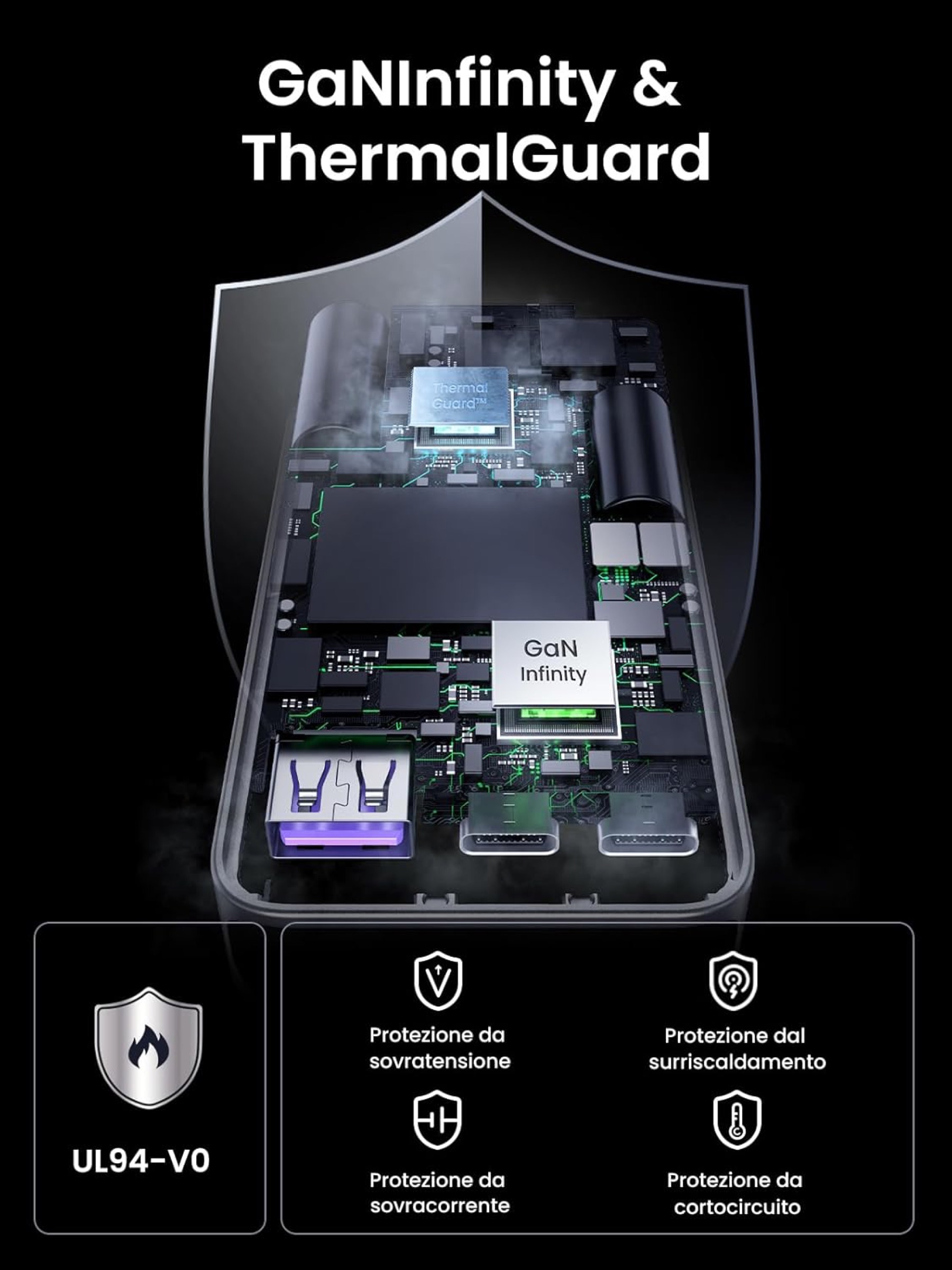 Supporta inoltre più protocolli come PPS 5A, PD 3.0, QC 4.0 e Samsung Super Fast Charging 2.0, quindi riesce a ricaricare metà della batteria di un S23 Ultra in appena 20 minuti.
