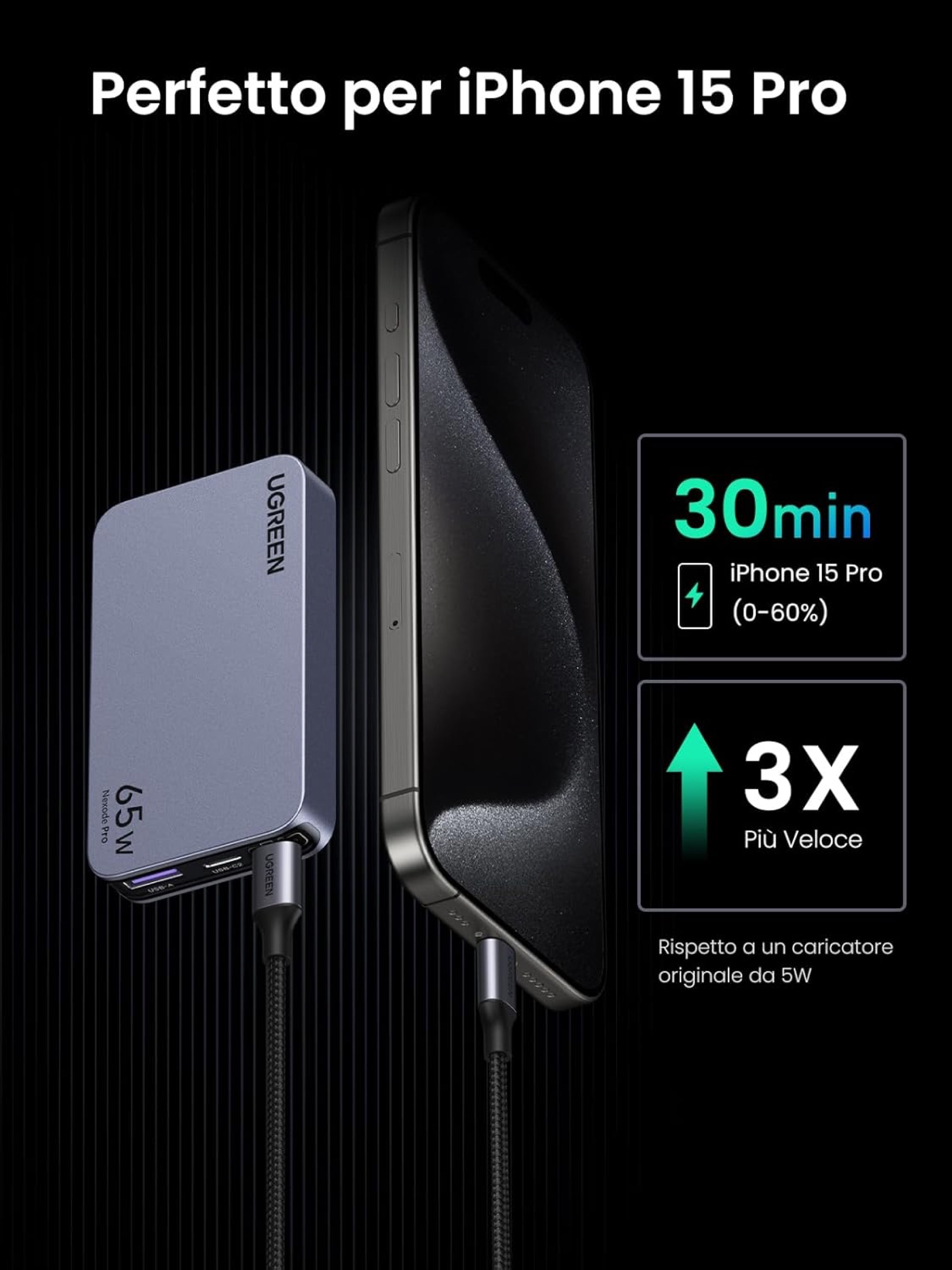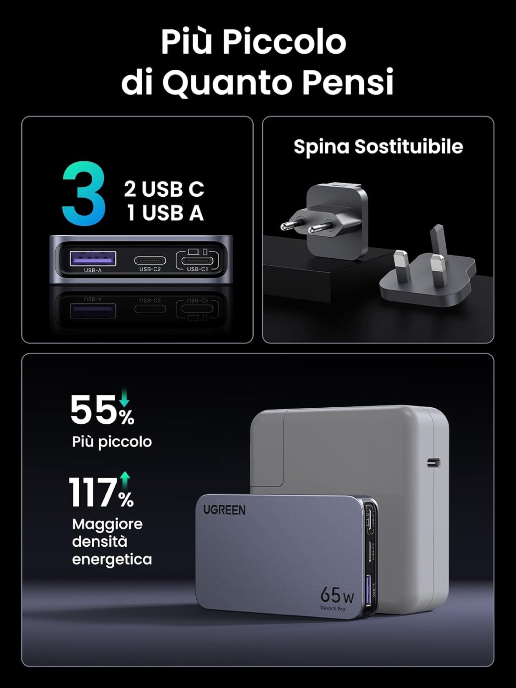 Avete presente il caricatore da 65 Watt che Apple include nella confezione dei MacBook Pro? adesso dimenticatelo perché UGREEN Nexode PRO offre la medesima potenza ma dispone di tre uscite anziché una sola ed è il 55% più sottile.