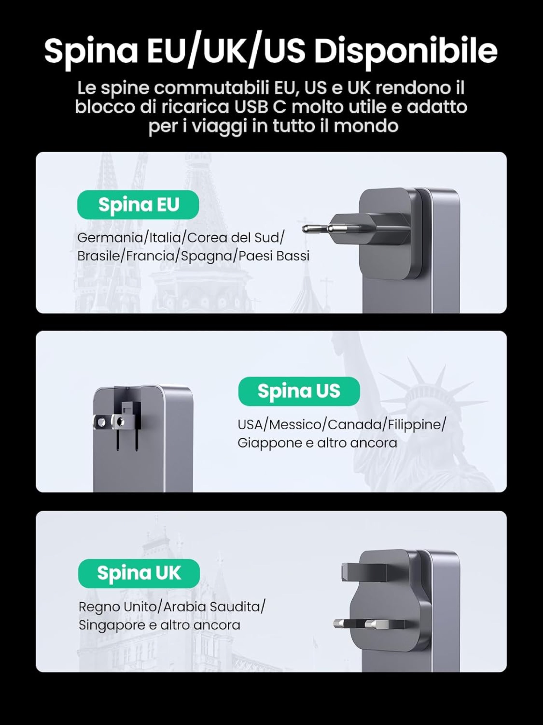 È un caricatore che non solo potete utilizzare tutto il giorno e tutti i giorni in casa e in ufficio, ma ve lo portate anche in vacanza perché la spina può essere facilmente sostituita con una di quelle presenti in confezione: incorpora infatti la presa US, mentre agganciando l’adattatore EU oppure quello UK lo utilizzate indistintamente in America e in Europa senza dover usare altro.