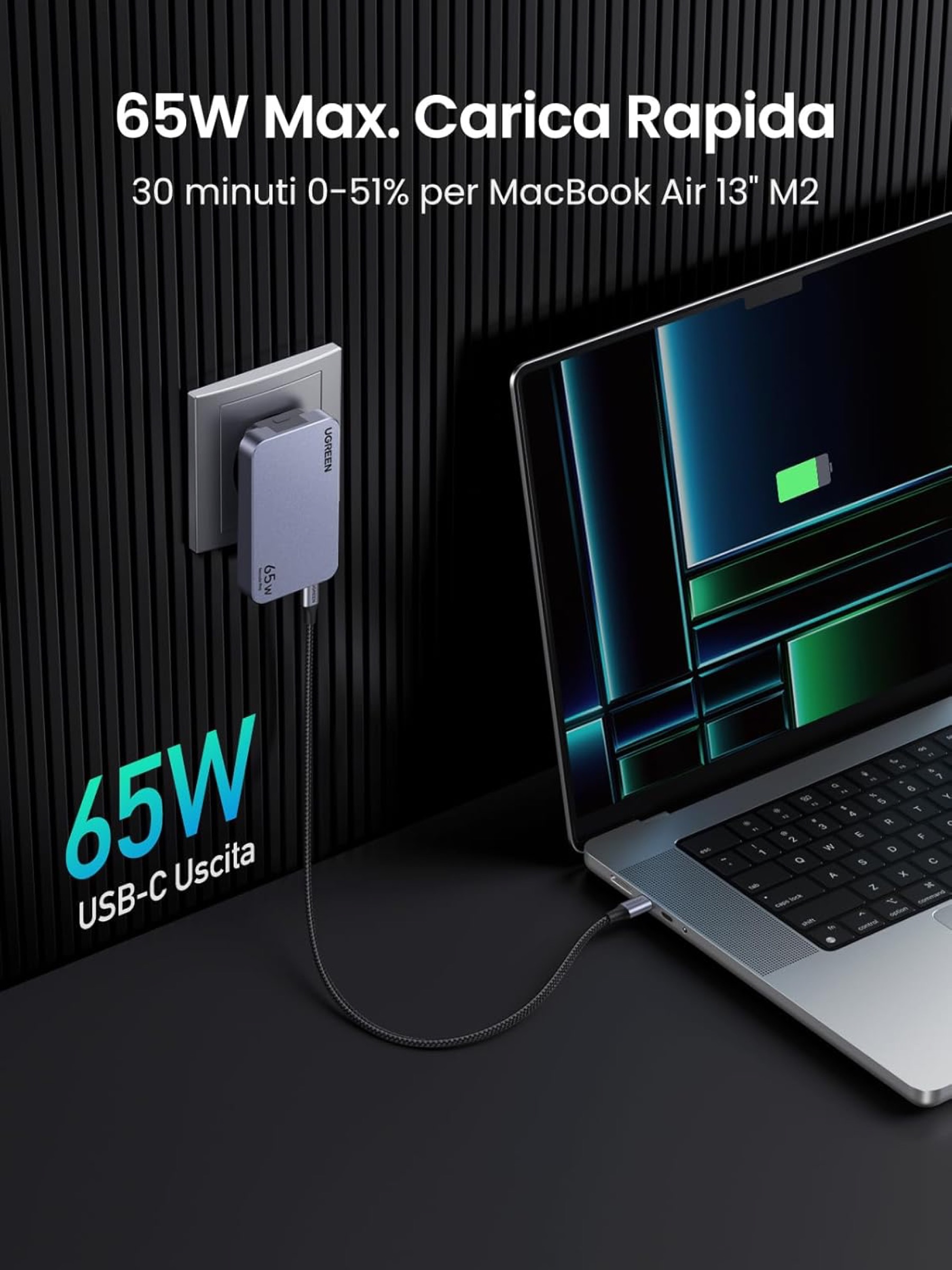 Secondo la scheda tecnica in un’ora porta un MacBook pro dallo 0% al 77%, mentre in mezz’ora ricarica la batteria di un MacBook Air 13″ M2 del 51% oppure di un iPhone 15 Pro del 60%.