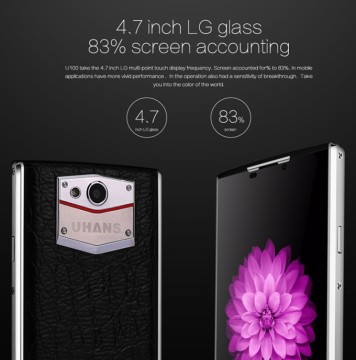 UHANS U100-2UHANS U100 ha un display IPS da 4,7 pollici, grande quindi quanto iPhone 6, con risoluzione 1.280 x 720 pixel e copertura in vetro Gorilla Glass. Il UHANS U100 Monta un processore quad-core Mediatek MT6735 da 1,3 GHz, GPU Mali-T721, 2 GB di RAM e 16 GB di spazio di archiviazione espandibile con microSD. Il retro è rivestito da un sottile strato di pelle capace di conferire un look & feel premium nonostante il prezzo low-cost.