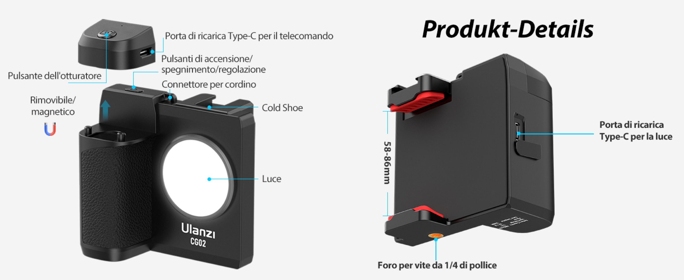 Il telecomando per lo scatto remoto funziona tramite Bluetooth e si aggancia-sgancia magneticamente dalla struttura, così da poterlo usare anche per scattare foto a distanza fino a un massimo di 30 metri, ottimo specialmente per foto di gruppo o per scatti a lunga esposizione su treppiede, così da non creare vibrazioni.
