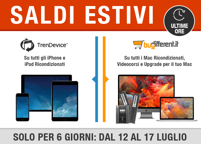 Stanno per terminare i Saldi Estivi su TrenDevice e BuyDifferent, siti partner del mondo Apple: avete ancora poche ore, fino 23:59 di oggi 17 Luglio.