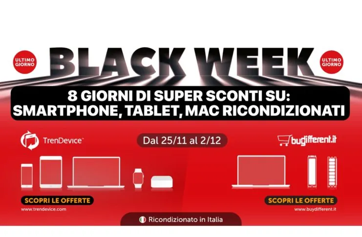 Oggi, 2 Dicembre, è l’ultimo giorno per approfittare degli sconti della Black Week di TrenDevice e BuyDifferent, iniziata il 25 Novembre e che terminerà oggi alle 23:59. Avete quindi l’ultimissima possibilità per approfittare dei prezzi super scontati su tutti gli iPhone, Samsung, iPad, Apple Watch, Apple TV e Mac Ricondizionati testati e garantiti 1 anno con un risparmio, di base, fino al 30% rispetto al nuovo.