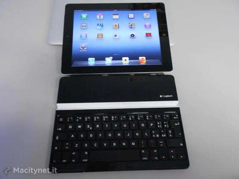 La tastiera di Logitech è realmente sottile: è spessa meno di un centimetro e che una volta collocata in posizione assieme all’iPad diventa un “assemblato” di un paio di centimetri, un po’ di più di un macBook Air al suo massimo punto di spessore. In posizione di riposo la tastiera aderisce perfettamente all’iPad e tutti i bordi sfilano altrettanto perfettamente. La tastiera stessa è realizzata parzialmente in materiale plastico lucido, con tasti in stile chiclet, sottili e squadrati e a corsa molto breve e anche questi realizzati in materiale plastico rigido. Il dorso è in alluminio del tutto simile a quello dell’iPad, solo con la scritta Logitech invece che la classica mela nera. La tastiera non è di tipo full size; ha i tasti funzione, ma sono da attivare premendo un tasto “FN”, al contrario di quanto accade su altre tastiere che hanno tasti funzione dedicati. La tastiera ha una batteria integrata, con un tasto per l’accoppiamento Bluetooth e un interruttore che l’accende e la spegne. Si ricarica mediante un cavo microUSB (da un lato) e USB (dall’altro) che si può collegare a qualunque porta di computer, Hub o caricabatterie USB. La cover è caratterizzata da una scanalatura centrale all’interno della quale si incastra l’iPad, collocato in posizione ergonomica per la scrittura, sia in orientamento orizzontale che in orientamento verticale. La scanalatura ha un magnete che tiene saldo il tablet solo se collocato in orientamento orizzontale unendosi al magnete interno all’iPad. Trattandosi di una scanalatura molto precisa, è possibile che sia necessario “denudare” l’iPad da eventuali cover per il dorso.