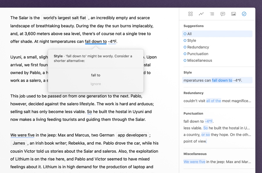 È un approccio basato cioè su delle regole e delle vere e proprie espressioni regolari che fanno il parsing del testo scritto “beccando” quello che non ci dovrebbe essere e mostrandolo all’autore per consentirgli di cancellarlo. Nessun mistero di “intelligenza artificiale” o gusti sintetici che si sovrappongono a quelli naturali degli esseri umani insomma. Invece, in questo modo e con maggiore puntualità Ulysses permette di correggere il proprio testo applicando le maiuscole giuste, eliminando le parole che non servono, la punteggiatura, la semantica, la ridondanza e così via.