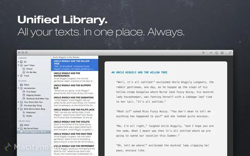 Dopo anni di sviluppo Ulysses III è finalmente disponibile su Mac App Store ed offre un approccio completamente nuovo nei software per la scrittura. Niente più salvataggi e ricerca dei file: tutti i materiali su cui l’utente lavora, appunti, fonti, versioni preliminari e definitive sono tutti conservati in un unico archivio che ripropone l’organizzazione e la praticità d’uso di Mail e iPhoto.