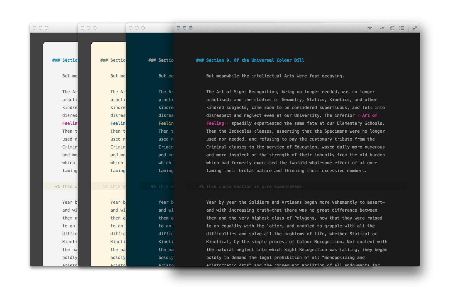 Inoltre è compatibile con l’importazione e l’esportazione di tutti i formati di testo sul mercato: PDF, Word, TXT, RTF, Markdown e anche HTML. Ulysses III è un serio avversario di Scrivener, dal quale lo separano fondamentalmente due concetti. Uno è l’approccio: Scrivener è per la gestione di testi in un editor minimalista ma pur sempre “ricco”, mentre Ulysses III segue la filosofia del testo semplice arricchito da markdown, in maniera opaca o trasparente.