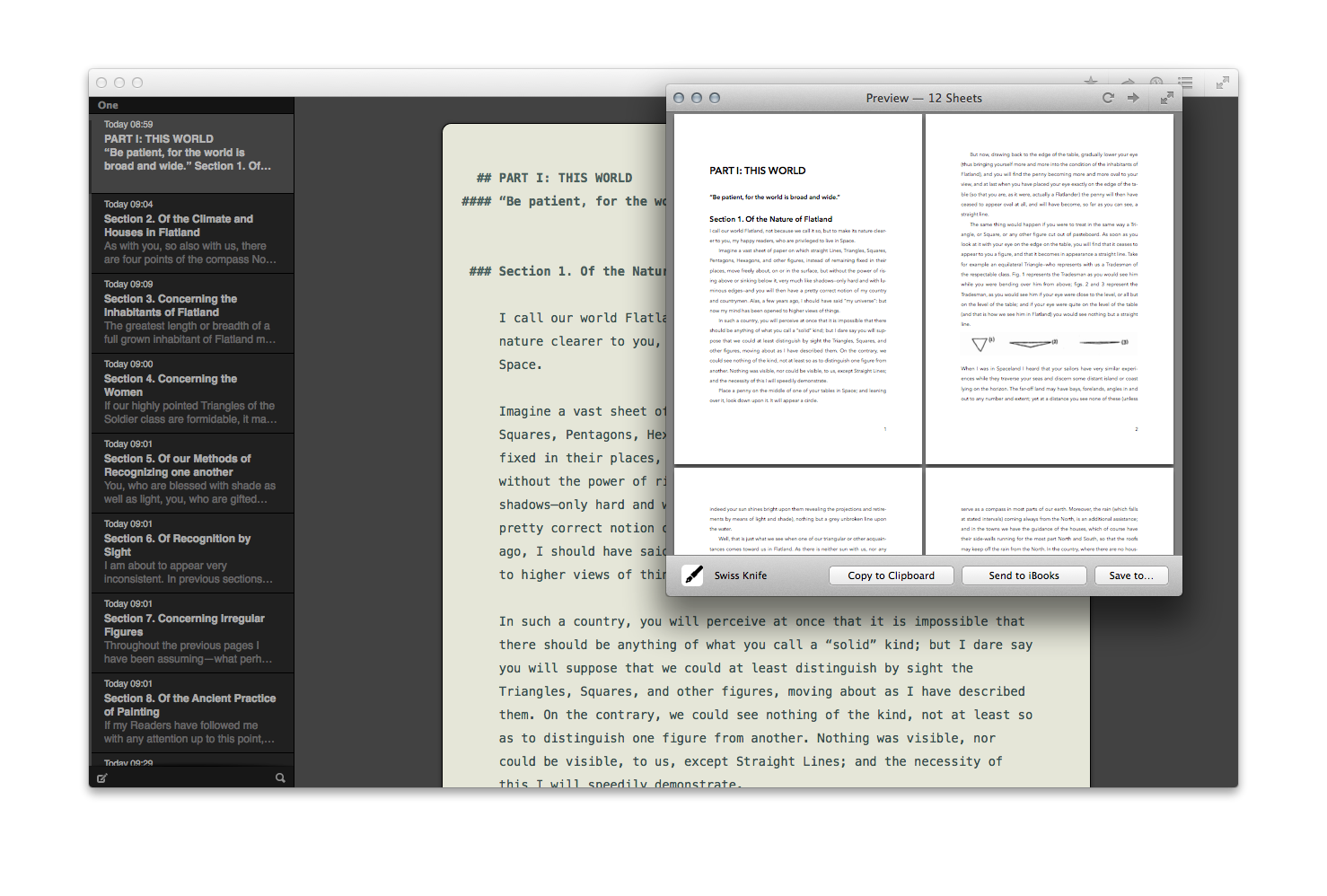 Ricapitoliamo un attimo quali sono i punti di forza prima di vedere le novità della versione 1.2 che Macity ha potuto provare in anteprima. Ulysses III ha la caratteristica che colpisce fin da subito, e fa a pieno titolo parte della nouvelle vague dei più nuovi editor di testo per Mac e iOS, di avere uno spazio di scrittura pulito, senza icone e strumenti di formattazione. Libero campo per scrivere tutto, dalla lettera breve sino al romanzo. Tramite iCloud Ulysses III tiene però assieme tutti i testi che uno realizza, come un jukebox stile iTunes, e permette di sincronizzarli anche con la app per iOS di The Soulmen, Daedalus, che è recentemente diventata ancora più efficace e che da par suo ha una interfaccia innovativa.