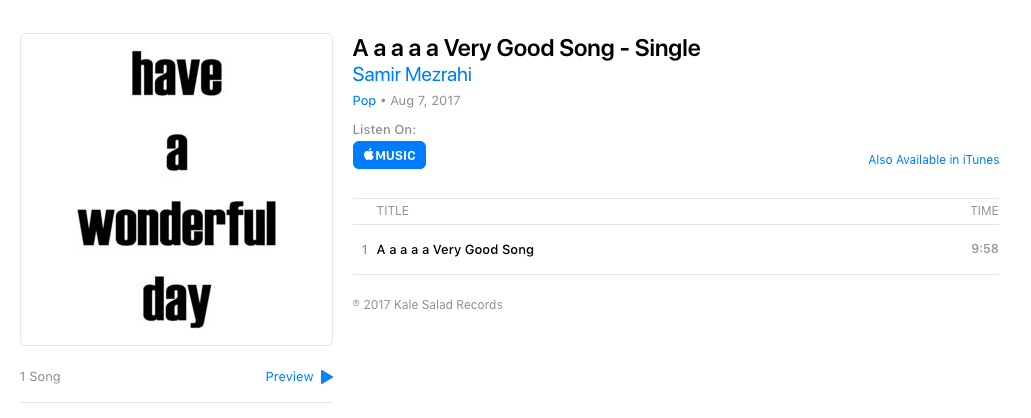Si intitola A a a a a Very Good Song ed è il nuovo singolo dell’artista Samir Mezrahi. Non è una “canzone” come le altre, ma si tratta di un brano che conta 9.58 minuti di silenzio. Sarebbe solo una “follia” come tutte le altre se non fosse che sta scalando la classifica di iTunes Store e che nasconde un motivo non proprio folle: aiutare a scegliere un brano migliore nella propria playlist