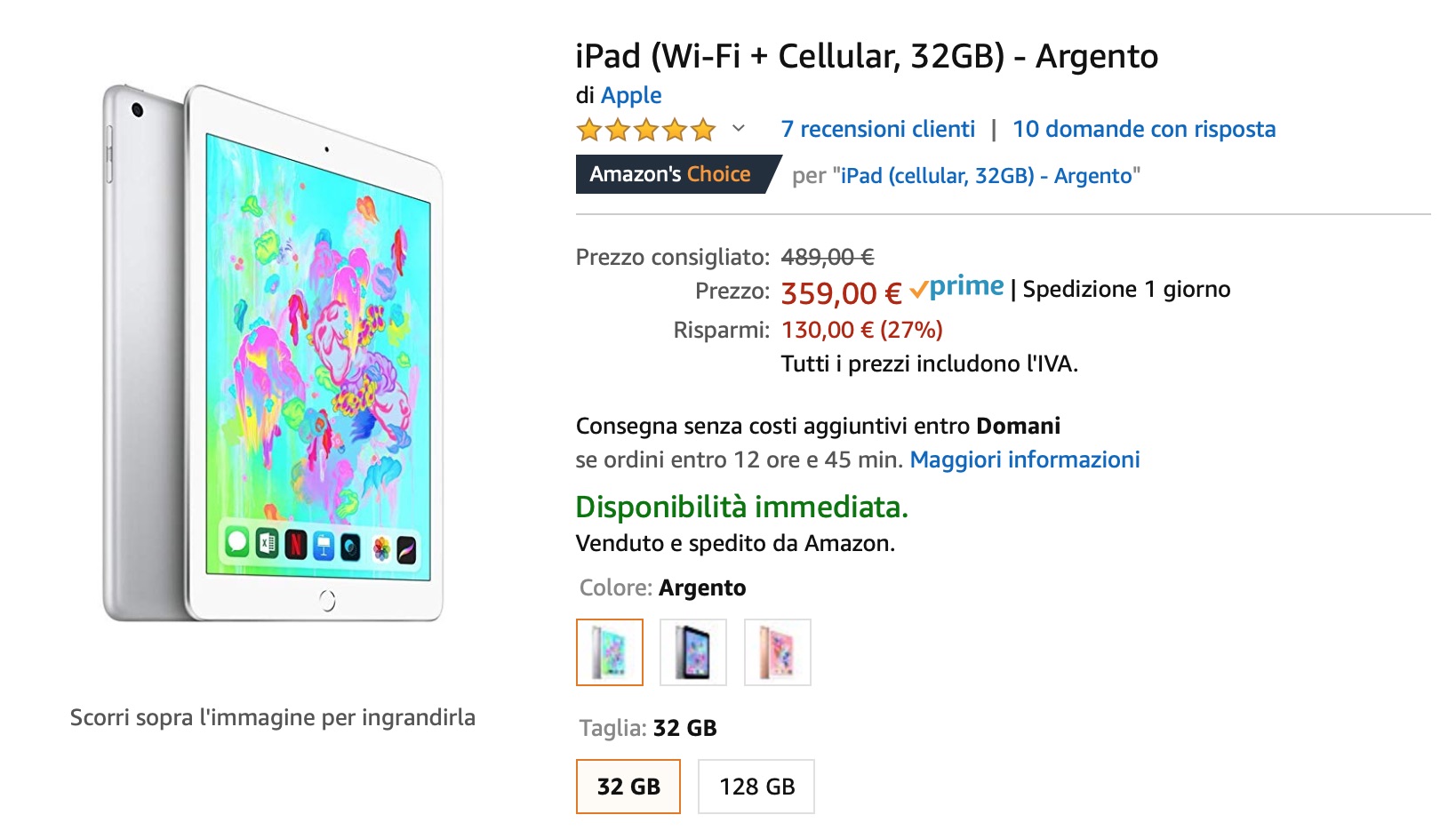 - iPad 2018 Wi-Fi e Cellular 32 GB 359 € (invece che 489 € – 27%)