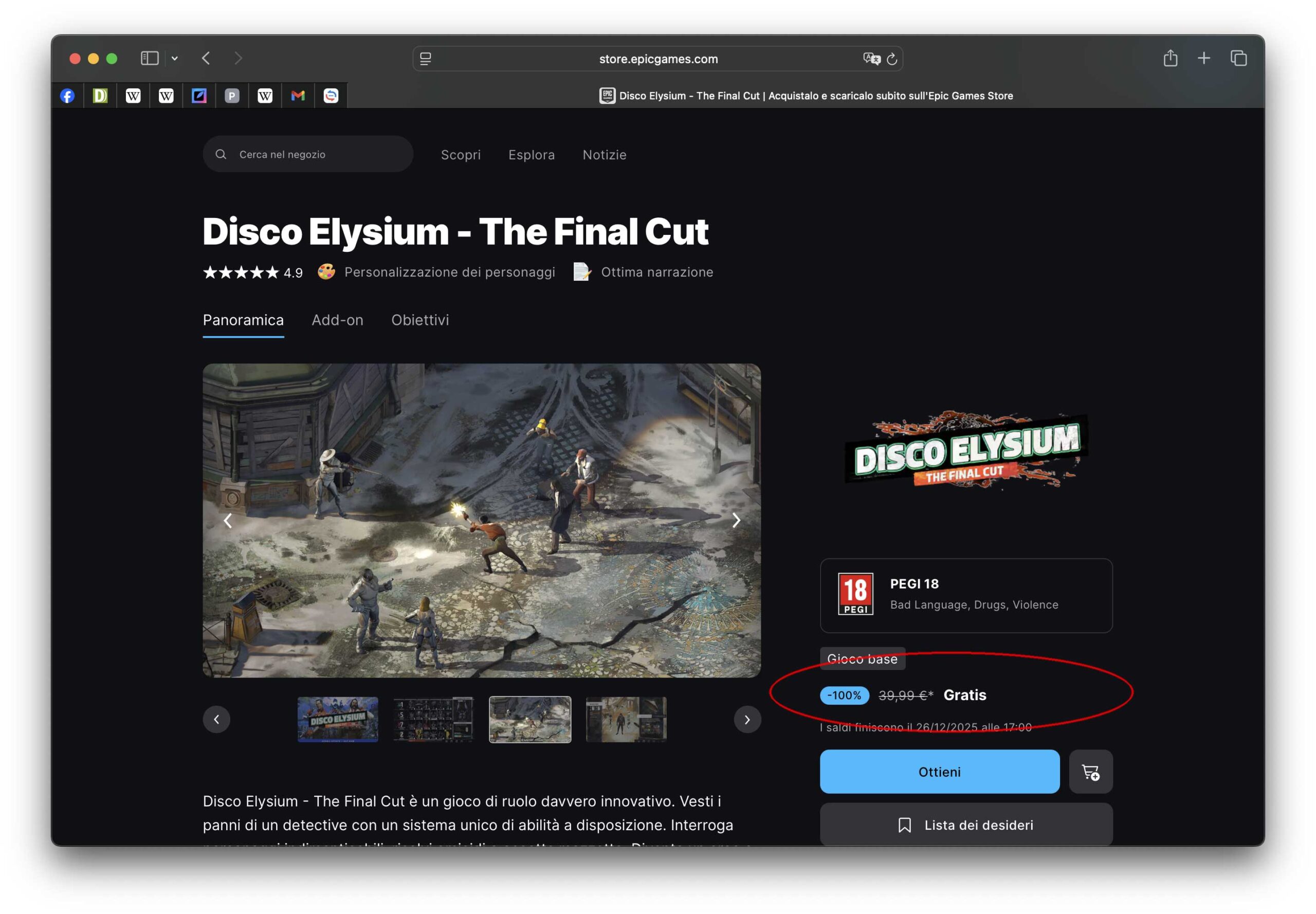Oggi ad esempio è il turno di Disco Elysium – The Final Cut, un gioco di ruolo utilizzabile anche su Mac (e normalmente venduto 39,99€) che vede l’utente nei panni di un detective con un sistema unico di abilità a disposizione, la possibilità di interrogare vari personaggi, risolvere omicidi e accettare mazzette, per “diventare un eroe o un completo disastro”.