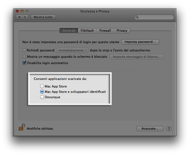 Come non ci stancheremo mai di ripetere questo e altri malware non sono così pericolosi perché per la loro esecuzione è necessario l’esplicito consenso dell’utente. Affinché siano eseguiti l’utente deve specificatamente disabilitare le funzioni di sicurezza integrate in OS X. Dalle Preferenze di Sistema selezionate “Sicurezza e Privacy” e in “Generali” assicuratevi che nella sezione “Consenti app scaricate da:” il pallino sia impostato su “Mac App Store e sviluppatori certificati”. Il Gatekeeper di OS X per default consente solo e soltanto l’esecuzione di applicazioni scaricate dal Mac App Store o provenienti da sviluppatori identificati da Apple.