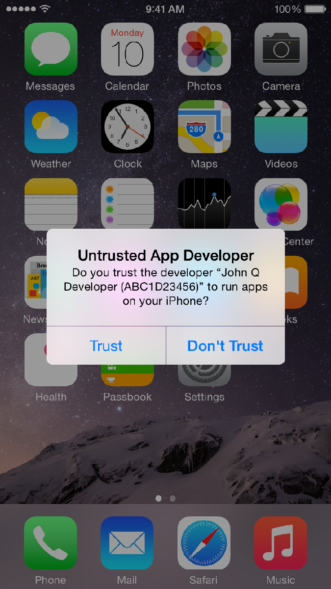 Apple stessa spiega che specifici messaggi di avviso sono mostrati sullo schermo dei dispositivi iOS quando si installano applicazioni da fonti non certificate (l’utente deve espressamente autorizzarne l’installazione).