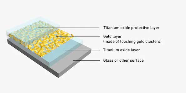 Si tratta in altre parole di una forma di riscaldamento passivo che non richiede altro che la luce del sole. Una pellicola d’oro con minuscoli fori viene inserita tra due strati di ossido di titanio (un materiale isolante); le proprietà di rifrazione dei die strati esterni incrementano l’efficacia del “riscaldamento”, mentre uno stato superiore in ossido di titanio proteggere dall’usura lo strato con la pellicola bucherellata. Il rivestimento è spesso solo 10nm, può essere prodotto in serie con processi di fabbricazione non troppo complessi e l’oro è usato in quantità così minuscola da rendere i costi del materiale non eccessivamente onerosi.
